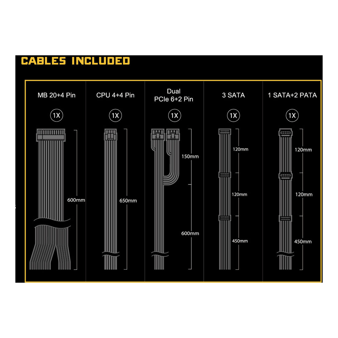 Asrock CL-650G Challenger. Potenza totale: 650 W. Connettore scheda madre: 20+4 pin ATX. Utilizzo: PC, Fattore di forma dell’unità di alimentazione (PSU): ATX, Certificazione 80 PLUS: 80 PLUS Gold. Colore del prodotto: Nero, Tipo di raffreddamento: Attivo, Diametro del ventilatore: 12 cm. Cavi inclusi: CPU, PATA, SATA