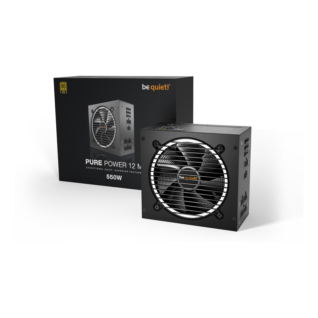 be quiet! Pure Power 12 M. Potenza totale: 550 W, Tensione di ingresso AC: 100 – 240 V, Potenza di picco: 600 W. Connettore scheda madre: 20+4 pin ATX, Lunghezza del cavo di alimentazione della scheda madre: 55 cm, Lunghezza del cavo di alimentazione SATA: 500,650,800,950 mm. Utilizzo: PC, Fattore di forma dell’unità di alimentazione (PSU): ATX, Certificazione 80 PLUS: 80 PLUS Gold. Colore del prodotto: Nero, Tipo di raffreddamento: Attivo, Diametro del ventilatore: 12 cm. Cavi inclusi: PATA, PCIe, Peripheral (Molex), SATA