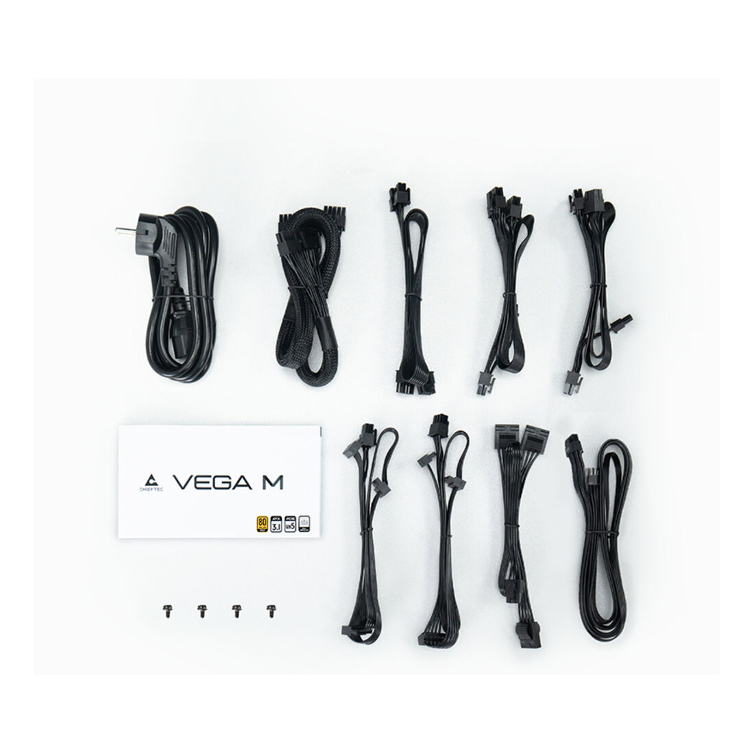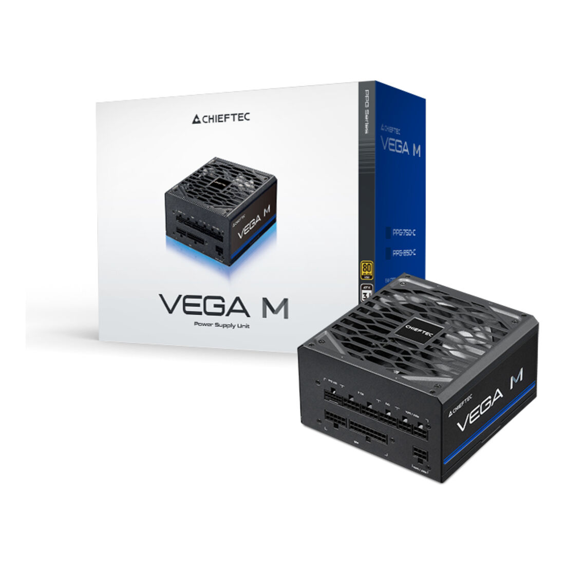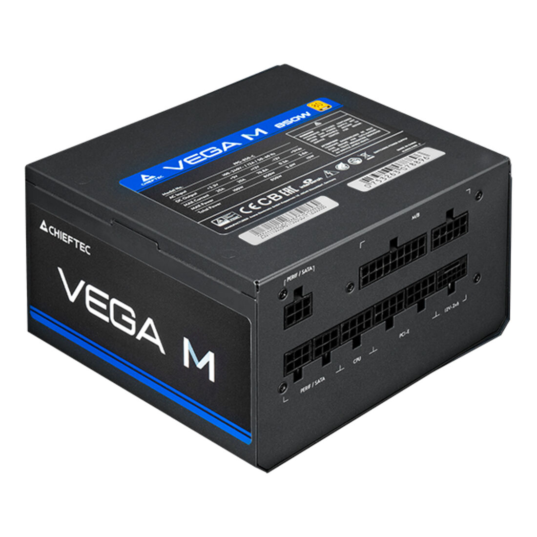 Chieftec Vega PPG-850-C. Potenza totale: 850 W, Tensione di ingresso AC: 100 – 240 V, Frequenza di ingresso AC: 50/60 Hz. Connettore scheda madre: 20+4 pin ATX, Lunghezza del cavo di alimentazione della scheda madre: 60 cm, Lunghezza del cavo di alimentazione SATA: 400 mm. Utilizzo: PC, Fattore di forma dell’unità di alimentazione (PSU): ATX, Certificazione 80 PLUS: 80 PLUS Gold. Colore del prodotto: Nero, Tipo di raffreddamento: Attivo, Diametro del ventilatore: 13,5 cm. Certificazione: 80PLUS Gold