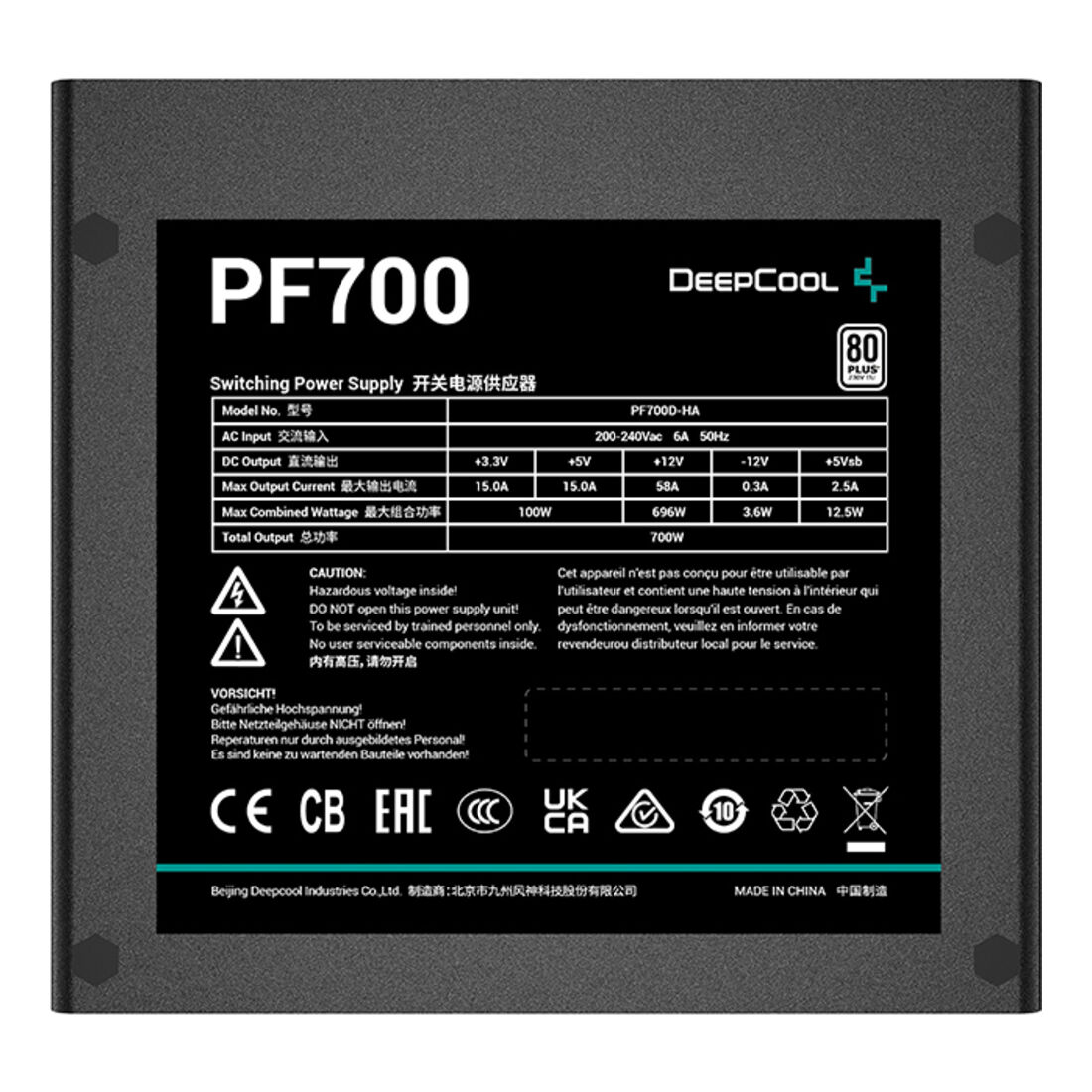 DeepCool PF700. Potenza totale: 700 W, Tensione di ingresso AC: 220 – 240 V, Frequenza di ingresso AC: 50 Hz. Connettore scheda madre: 20+4 pin ATX, Lunghezza del cavo di alimentazione della scheda madre: 55 cm, Lunghezza del cavo di alimentazione SATA: 450,600,750,900 mm. Utilizzo: PC/server, Fattore di forma dell’unità di alimentazione (PSU): ATX, Certificazione 80 PLUS: 80 PLUS. Colore del prodotto: Nero, Tipo di raffreddamento: Attivo, Diametro del ventilatore: 12 cm. Cavi inclusi: AC