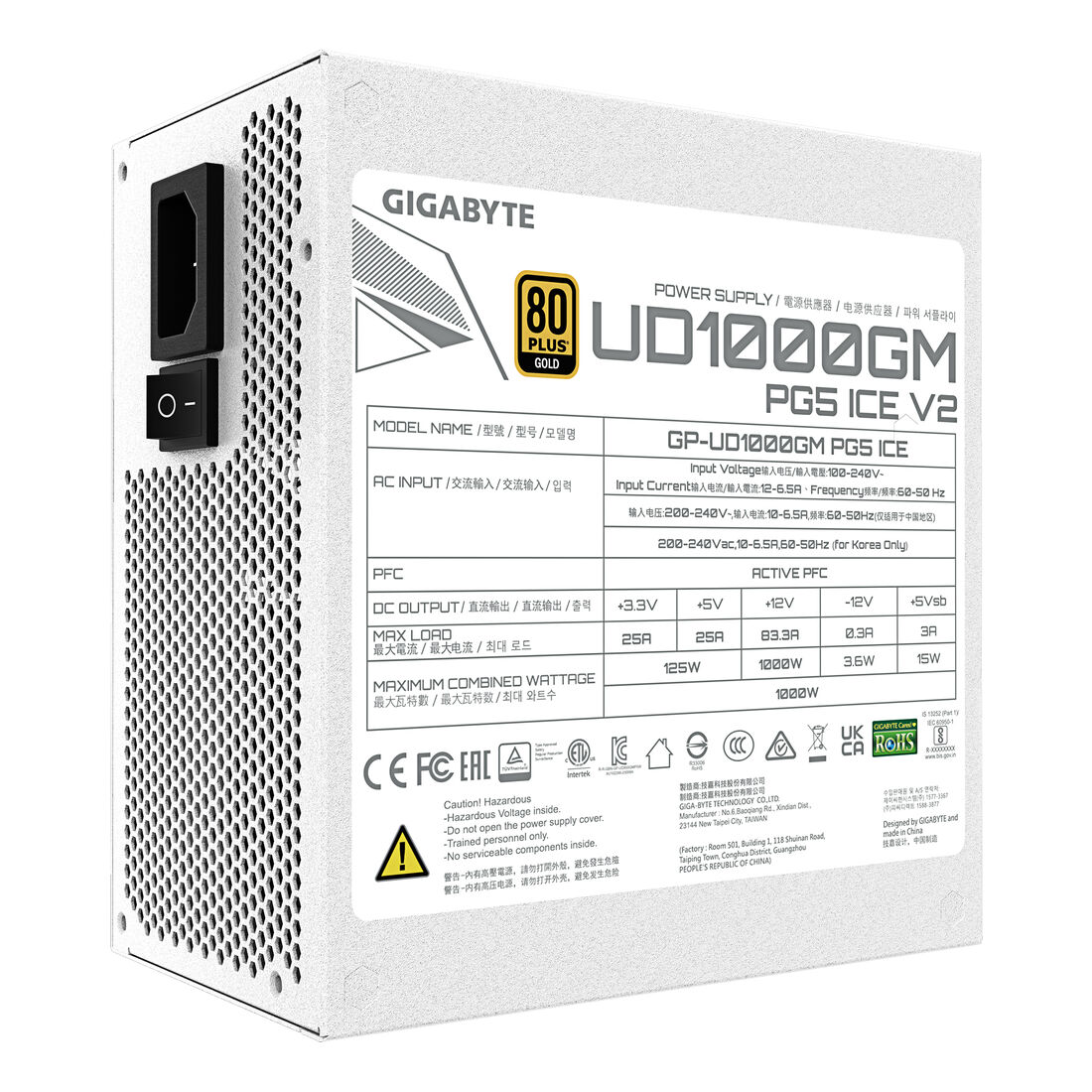 GIGABYTE UD1000GM PG5 V2 ICE Alimentatore – PCIe Gen 5.1, 80 PLUS Gold, Design completamente modulare, Ventola da 120 mm, Compatibile con ATX 3.1, Spina EU. Potenza totale: 1000 W, Tensione di ingresso AC: 100 – 240 V, Frequenza di ingresso AC: 50/60 Hz. Connettore scheda madre: 20+4 pin ATX, Lunghezza del cavo di alimentazione della scheda madre: 61 cm, Lunghezza del cavo dei connettori di alimentazione PCI Express (12+4 pin): 700 mm. Utilizzo: PC, Fattore di forma dell’unità di alimentazione (PSU): ATX, Certificazione 80 PLUS: 80 PLUS Gold. Colore del prodotto: Bianco, Tipo di raffreddamento: Attivo, Diametro del ventilatore: 12 cm. Larghezza: 150 mm, Profondità: 140 mm, Altezza: 86 mm