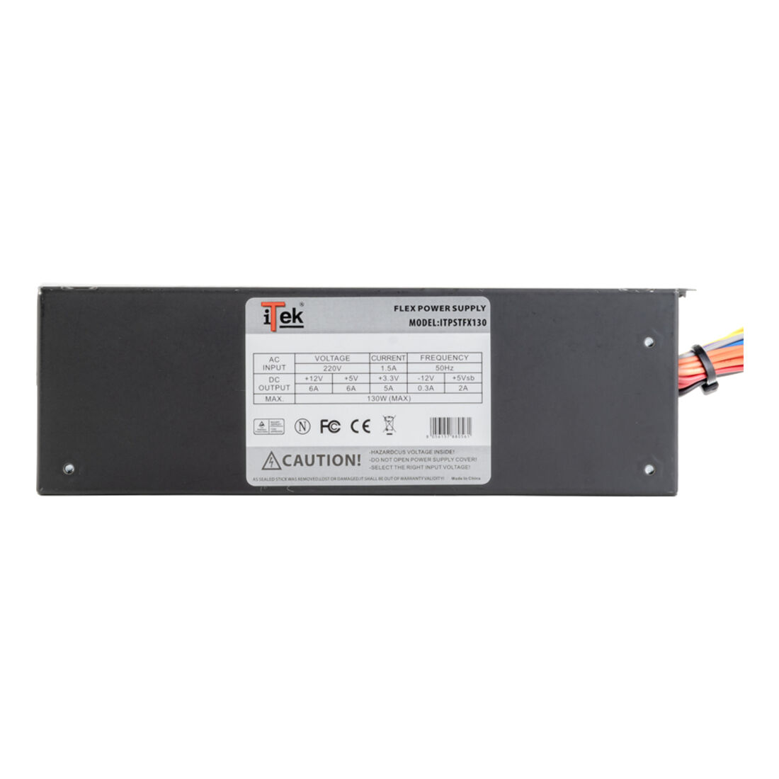 itek ITPSTFX130. Potenza totale: 130 W, Tensione di ingresso AC: 220 V. Connettore scheda madre: 20+4 pin ATX, Tipo di cablaggio: Non modulare. Utilizzo: PC, Fattore di forma dell’unità di alimentazione (PSU): ATX, Tempo medio tra guasti (MTBF): 100000 h. Colore del prodotto: Nero, Diametro del ventilatore: 4 cm. Larghezza: 48 mm, Profondità: 170 mm, Altezza: 55 mm