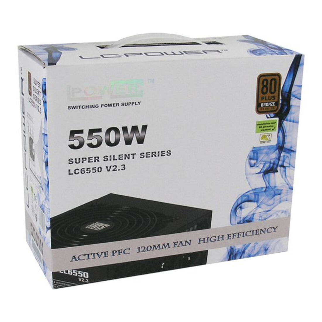 LC-Power LC6550 V2.3. Potenza totale: 550 W, Tensione di ingresso AC: 230 V, Frequenza di ingresso AC: 50 Hz. Connettore scheda madre: 20+4 pin ATX, Lunghezza del cavo di alimentazione della scheda madre: 45 cm, Lunghezza del cavo di alimentazione CPU: 45 cm. Utilizzo: PC, Fattore di forma dell’unità di alimentazione (PSU): ATX, Certificazione 80 PLUS: 80 PLUS Bronze. Colore del prodotto: Nero, Diametro del ventilatore: 12 cm, Numero di ventole: 1 ventola(e). Larghezza: 150 mm, Profondità: 140 mm, Altezza: 86 mm