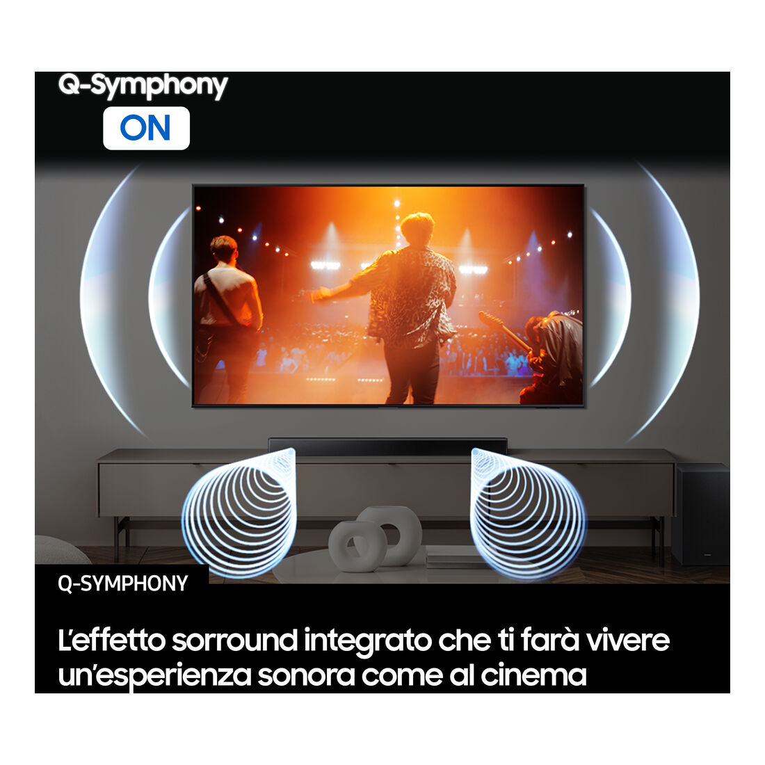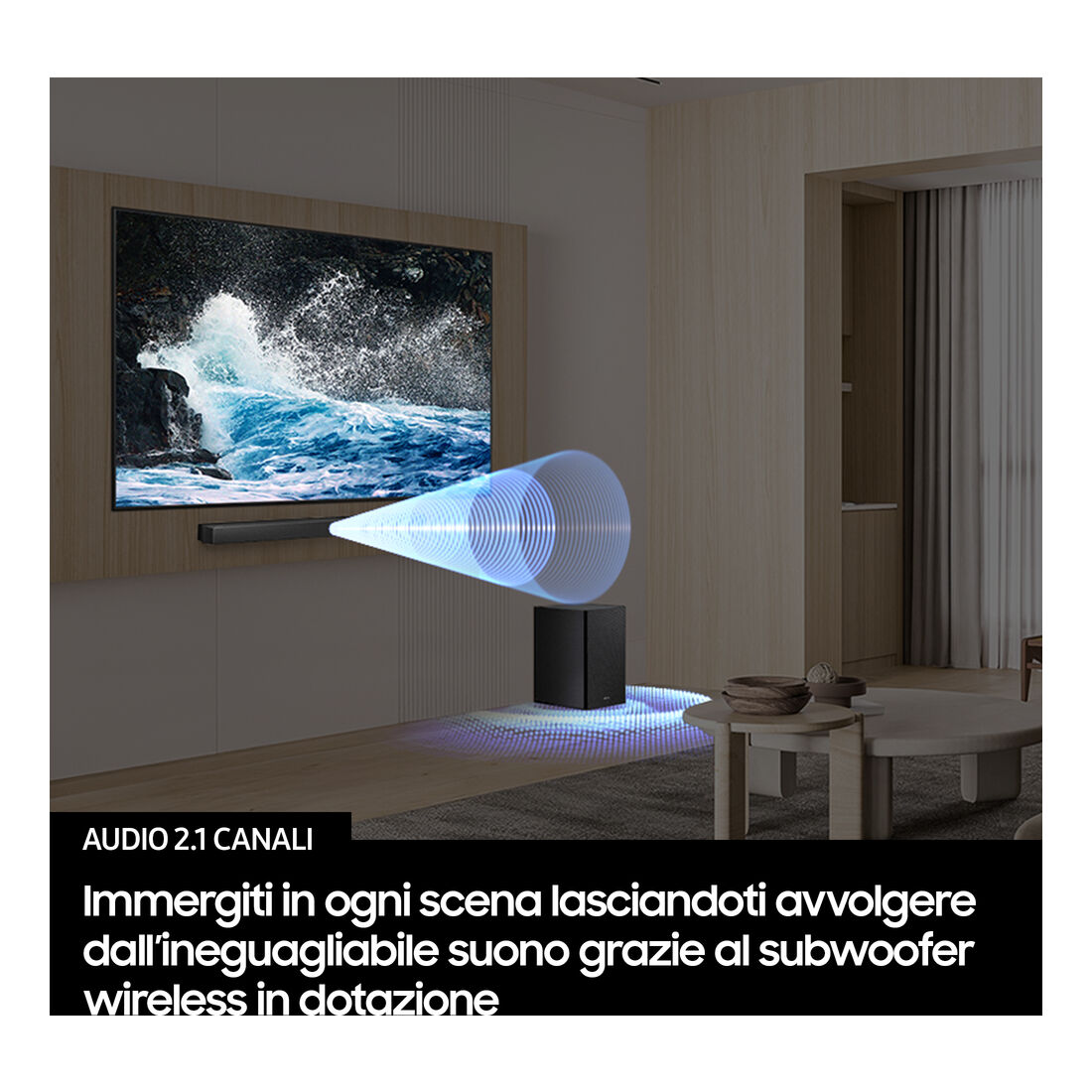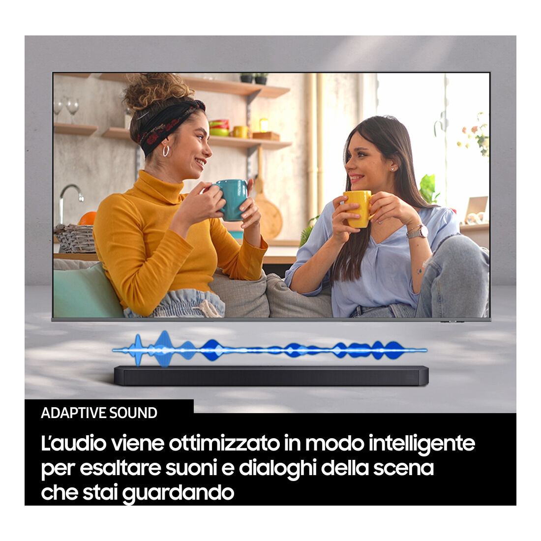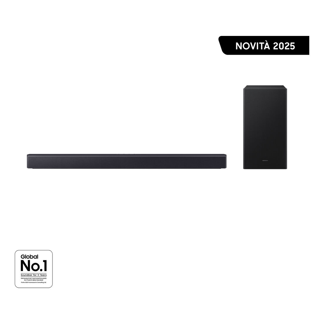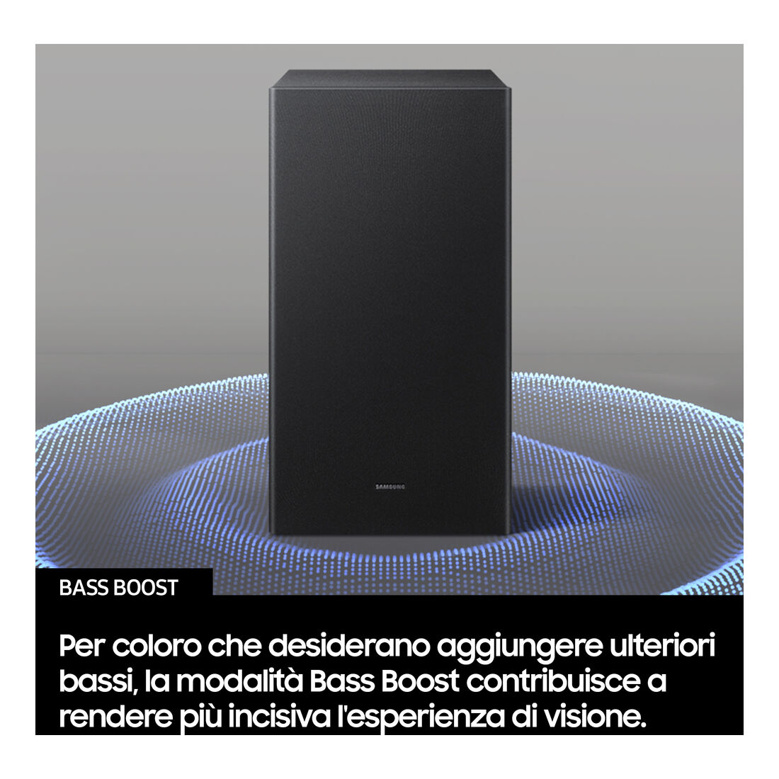 Samsung B-Series Soundbar HW-B450F/ZF, Audio 2.1 canali, Wireless Dolby 2ch, 2025. Sistema audio: 2.1 canali, Formato audio integrato: DTS Virtual:X, Dolby 2.0, Audio Dolby, Modalità equalizzatore: Adaptive Lite, Amplificazione per basso, Game Pro, Standard, Espansione del suono surround. Connettività del subwoofer: Wireless. Colore del prodotto: Nero, Nome del colore: Titan Black, Formati audio supportati: AAC, AIFF, FLAC, MP3, OGG, WAV. Tecnologia di connessione: Con cavo e senza cavo. Consumo energetico del soundbar: 25 W, Consumo subwoofer: 40 W, Consumi (modalità stand-by): 0,5 W