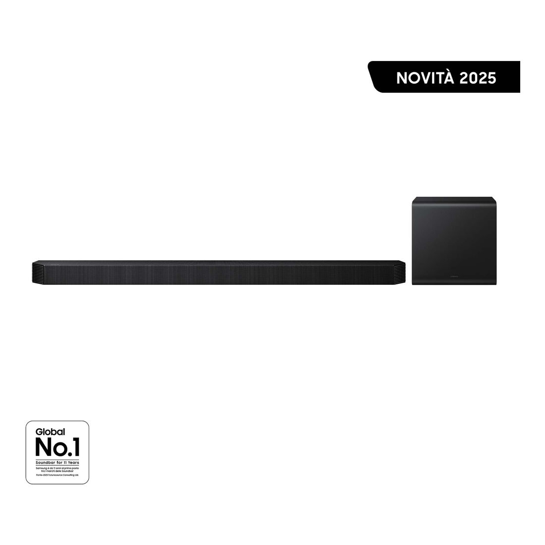 Samsung Soundbar HW-QS700F/ZF, Audio 3.1.2 canali, Wireless Dolby Atmos, 2025. Sistema audio: 3.1.2 canali, Potenza in uscita (RMS): 345 W, Formato audio integrato: DTS 5.1, DTS Virtual:X, Dolby Atmos, Dolby Digital Plus, Dolby TrueHD. Potenza RMS dell’altoparlante soundbar: 38 W. Tipo di subwoofer: Subwoofer attivo, Connettività del subwoofer: Wireless, Potenza RMS subwoofer: 160 W. Colore del prodotto: Nero, Nome del colore: Titan Black, Tecnologia High Dynamic Range (HDR): High Dynamic Range 10+ (HDR10 Plus). Tecnologia di connessione: Con cavo e senza cavo