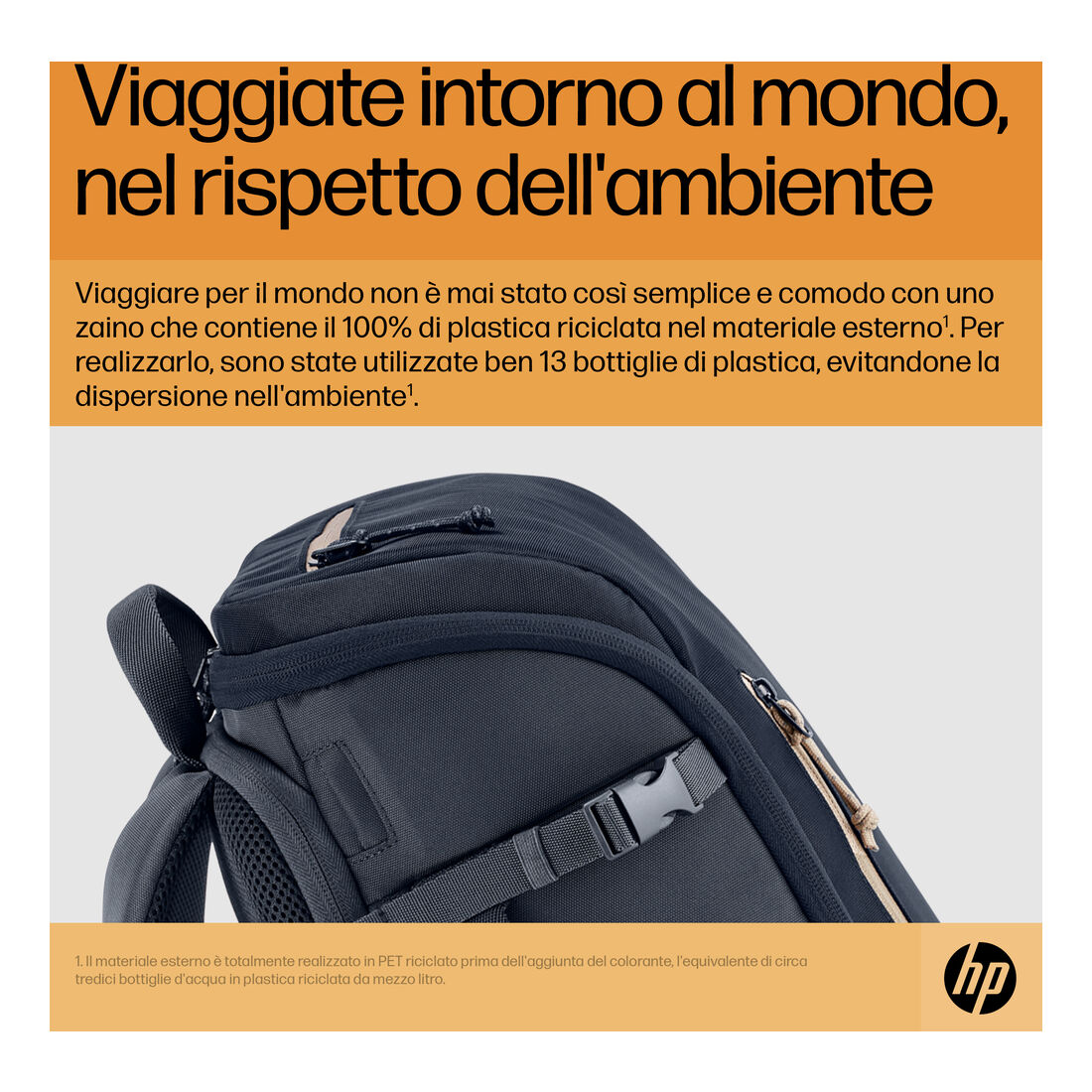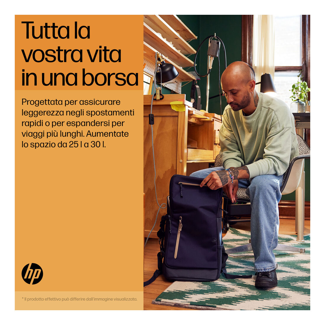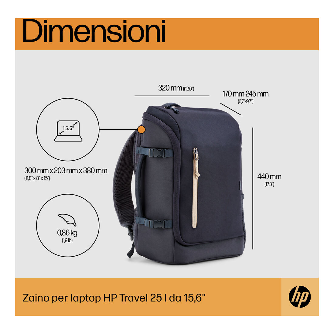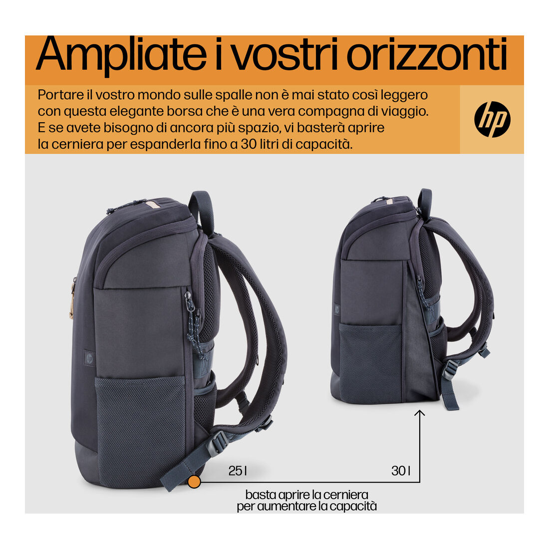HP Zaino blu per laptop da 15,6″ Travel 25 litri. Capienza massima dimensioni dello schermo: 39,6 cm (15.6″). Peso: 860 g