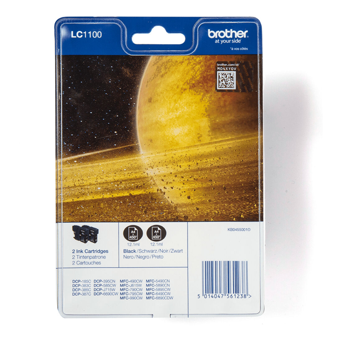 Brother LC1100BKBP2. Tipo di fornitura: Doppia confezione, Colori di stampa: Nero, Quantità per pacco: 2 pz, Resa in pagine dell’inchiostro a colori: 450 pagine