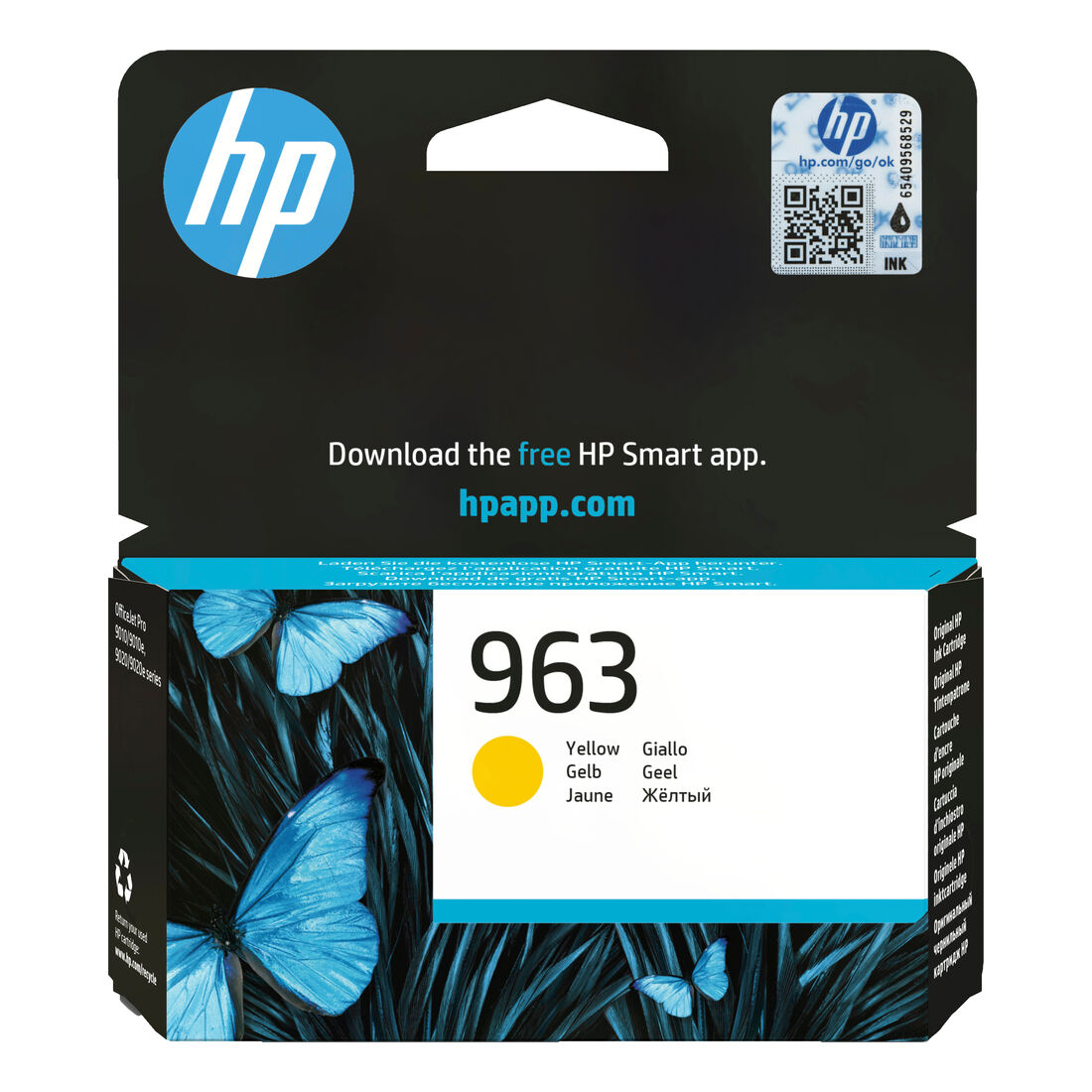 HP Cartuccia di inchiostro giallo originale 963. Tipo di inchiostro a colori: Inchiostro a base di pigmento, Tipo di cartuccia: Resa standard, Resa in pagine dell’inchiostro a colori: 700 pagine, Volume dell’inchiostro a colori: 10,7 ml, Colori di stampa: Giallo, Quantità per pacco: 1 pz
