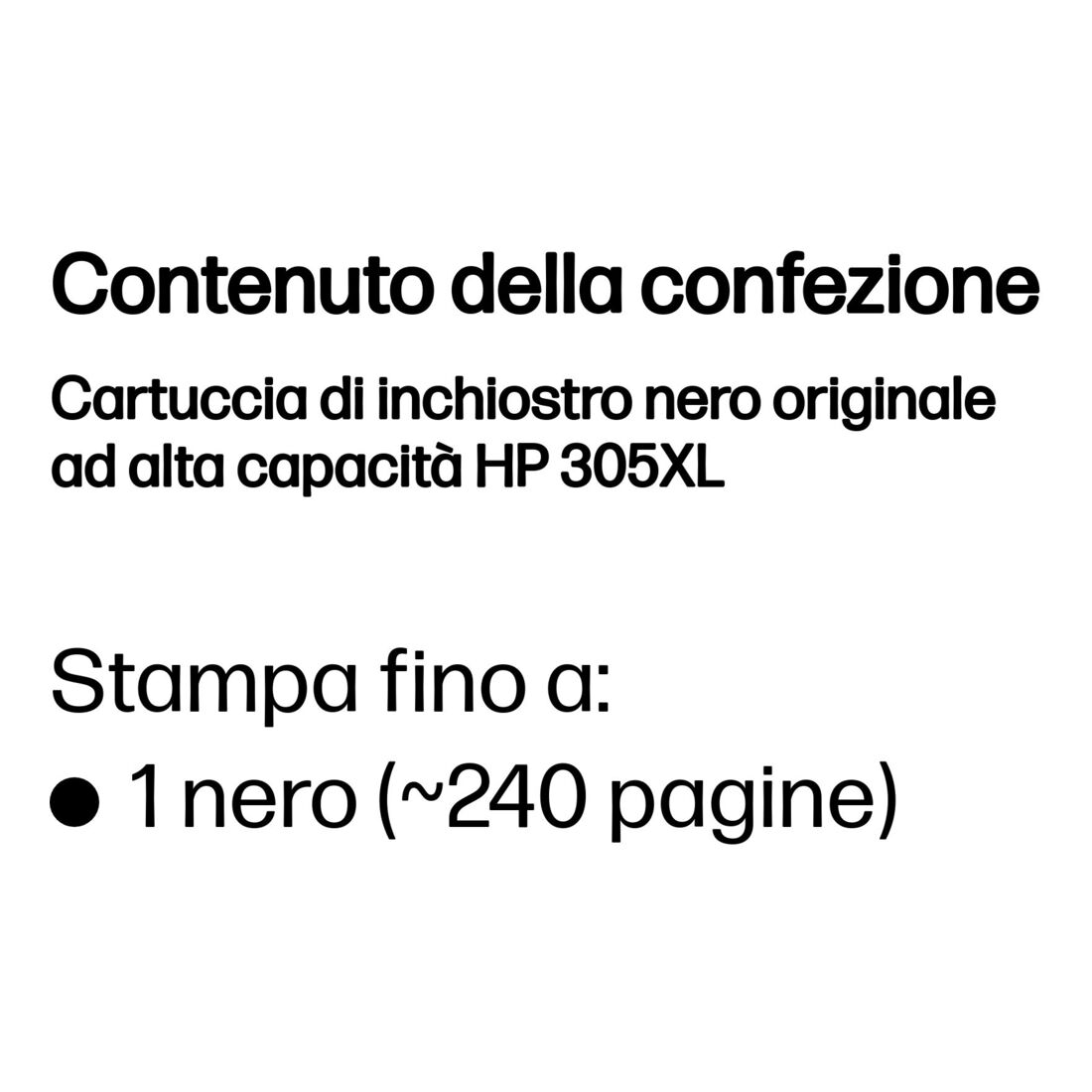 HP Cartuccia di inchiostro nero originale ad alta capacità 305XL. Tipo di cartuccia: Resa elevata (XL), Tipo di inchiostro nero: Inchiostro a base di pigmento, Volume dell’inchiostro nero: 4 ml, Colori di stampa: Nero, Quantità per pacco: 1 pz, Resa in pagine dell’inchiostro a colori: 240 pagine