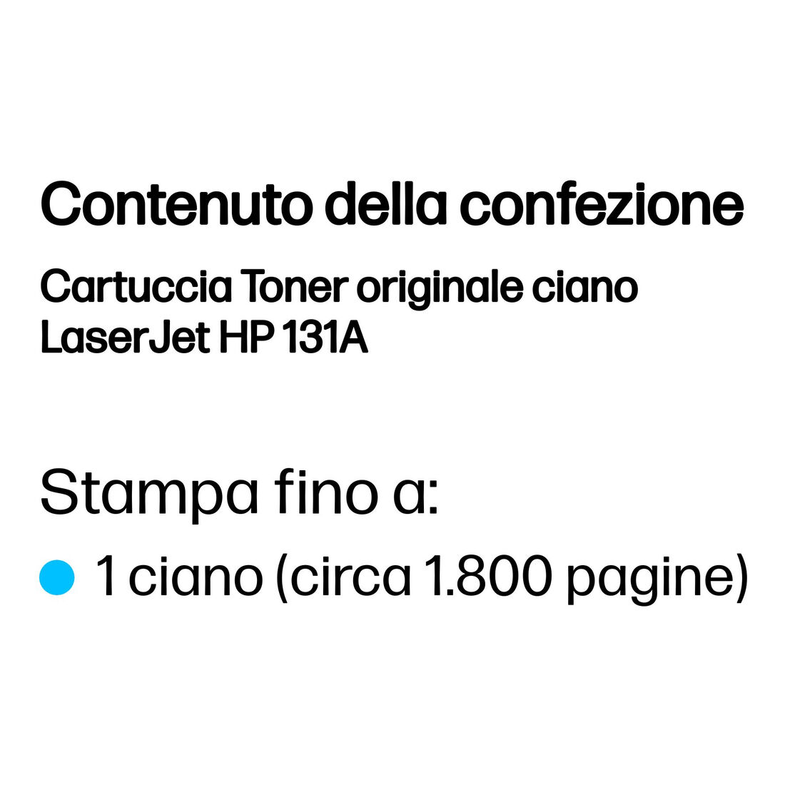 HP Cartuccia Toner originale ciano LaserJet 131A. Resa in pagine del toner a colori: 1800 pagine, Colori di stampa: Ciano, Quantità per pacco: 1 pz