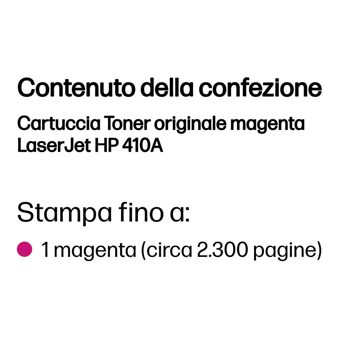 HP Cartuccia Toner originale magenta LaserJet 410A. Resa in pagine del toner a colori: 2300 pagine, Colori di stampa: Magenta, Quantità per pacco: 1 pz