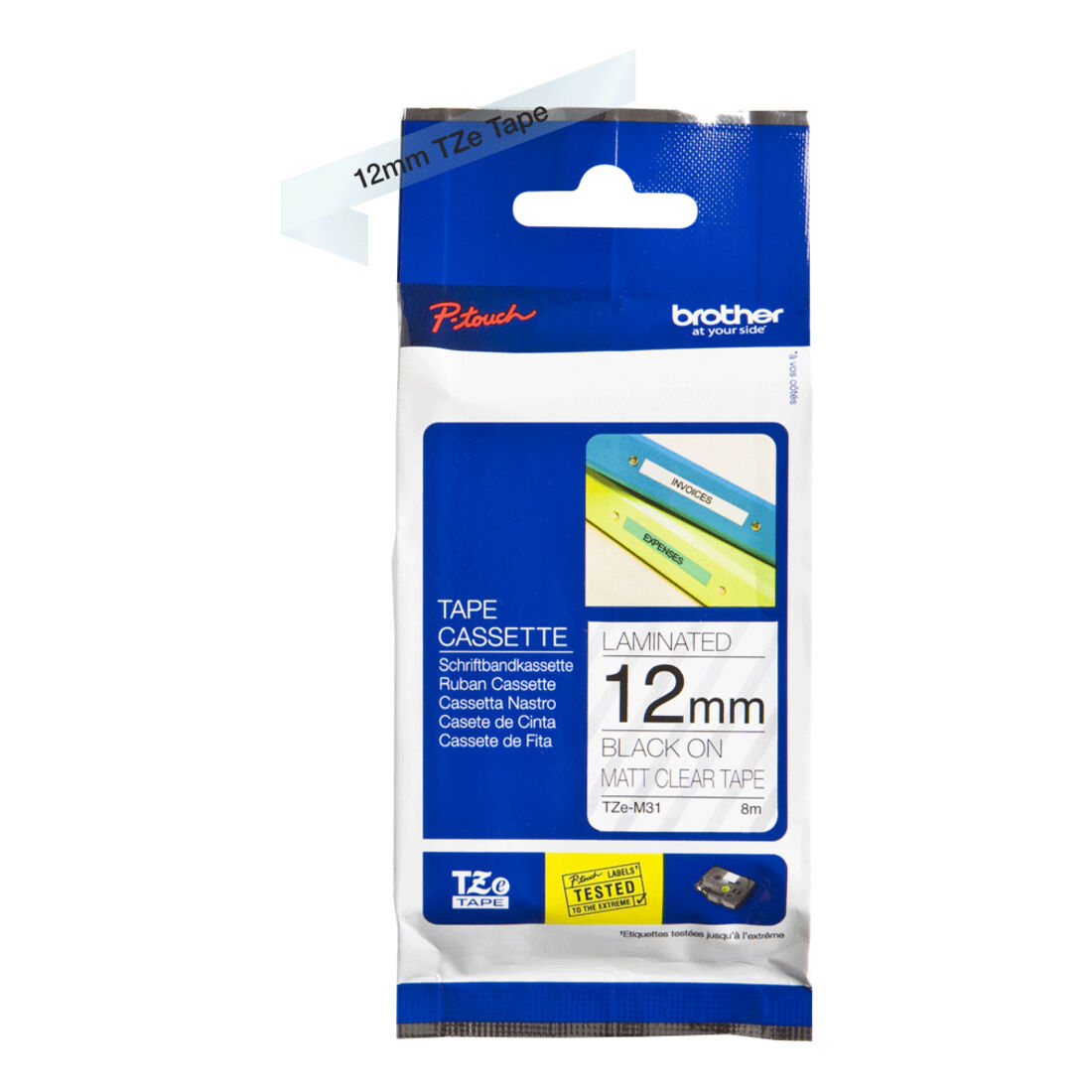 Brother TZE-M31. Colore etichetta: Nero trasparente, Tipo nastro: TZe, Paese di origine: Cina. Ampiezza nastro: 1,2 cm, Lunghezza nastro: 8 m, Larghezza: 17 mm. Altezza del pallet: 16,2 cm, Numero di cartoni per pallet: 36 pz, Numero di livelli per pallet: 6 pz. Dimensione nastro: 1,2 cm