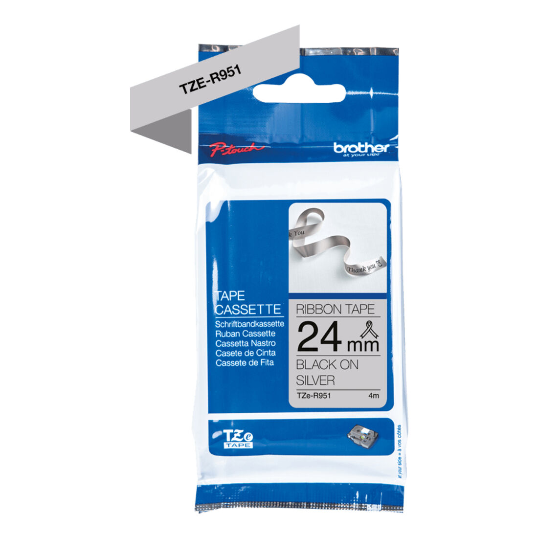 Brother TZE-R951. Colore etichetta: Nero su argento, Tipo nastro: TZe, Colore del prodotto: Argento. Ampiezza nastro: 2,4 cm, Lunghezza nastro: 4 m, Larghezza: 30 mm. Altezza del pallet: 16,9 cm, Numero di cartoni per pallet: 187 pz, Numero di livelli per pallet: 11 pz