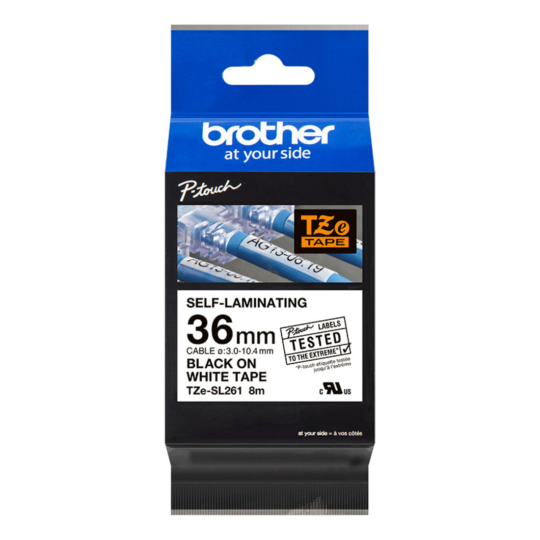 Brother TZE-SL261. Colore etichetta: Nero su bianco, Tipo nastro: TZe, Colore del prodotto: Bianco. Ampiezza nastro: 3,6 cm, Lunghezza nastro: 8 m, Larghezza: 40 mm. Altezza del pallet: 17,3 cm, Numero di cartoni per pallet: 96 pz, Numero di livelli per pallet: 12 pz