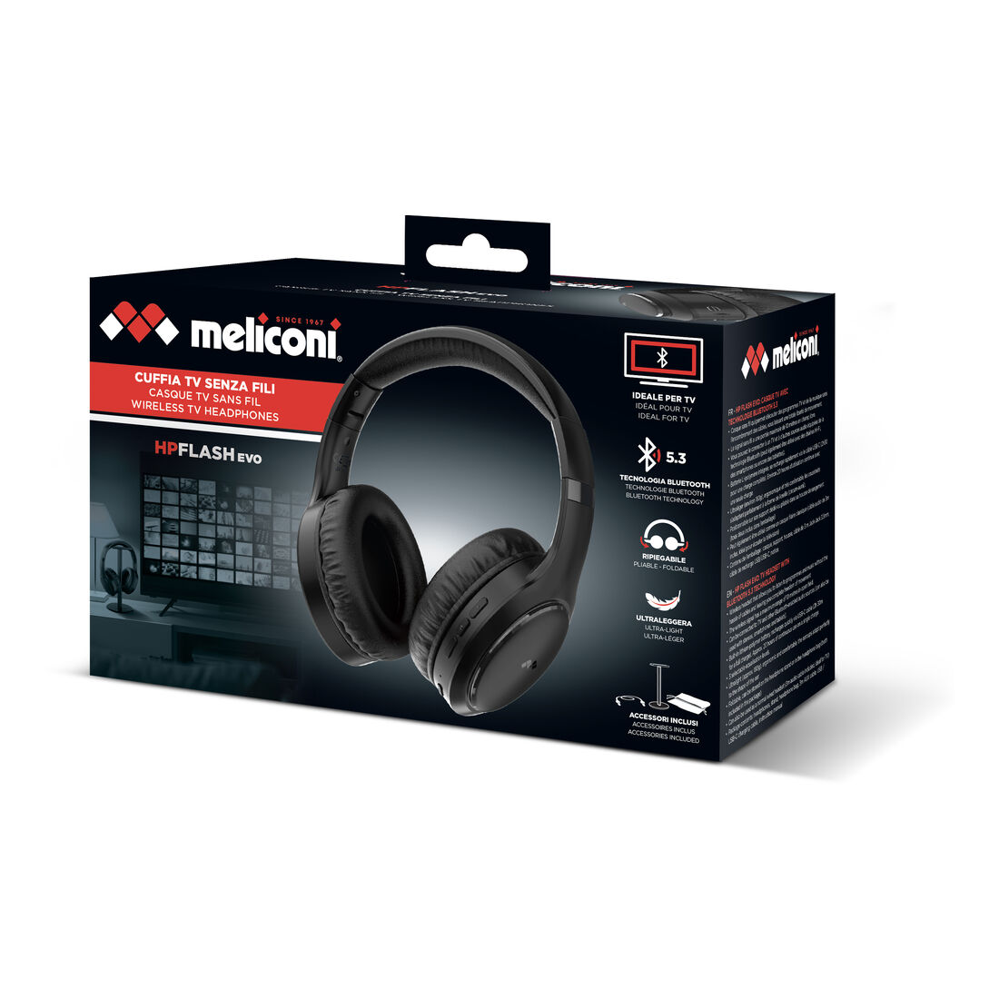 Meliconi Hp Flash Evo. Tipo di prodotto: Auricolare. Tecnologia di connessione: Con cavo e senza cavo, Bluetooth. Utilizzo raccomandato: MUSICA. Frequenza cuffia: 20 – 20000 Hz. Range wireless: 10 m. Lunghezza cavo: 3 m. Peso: 182 g. Colore del prodotto: Nero