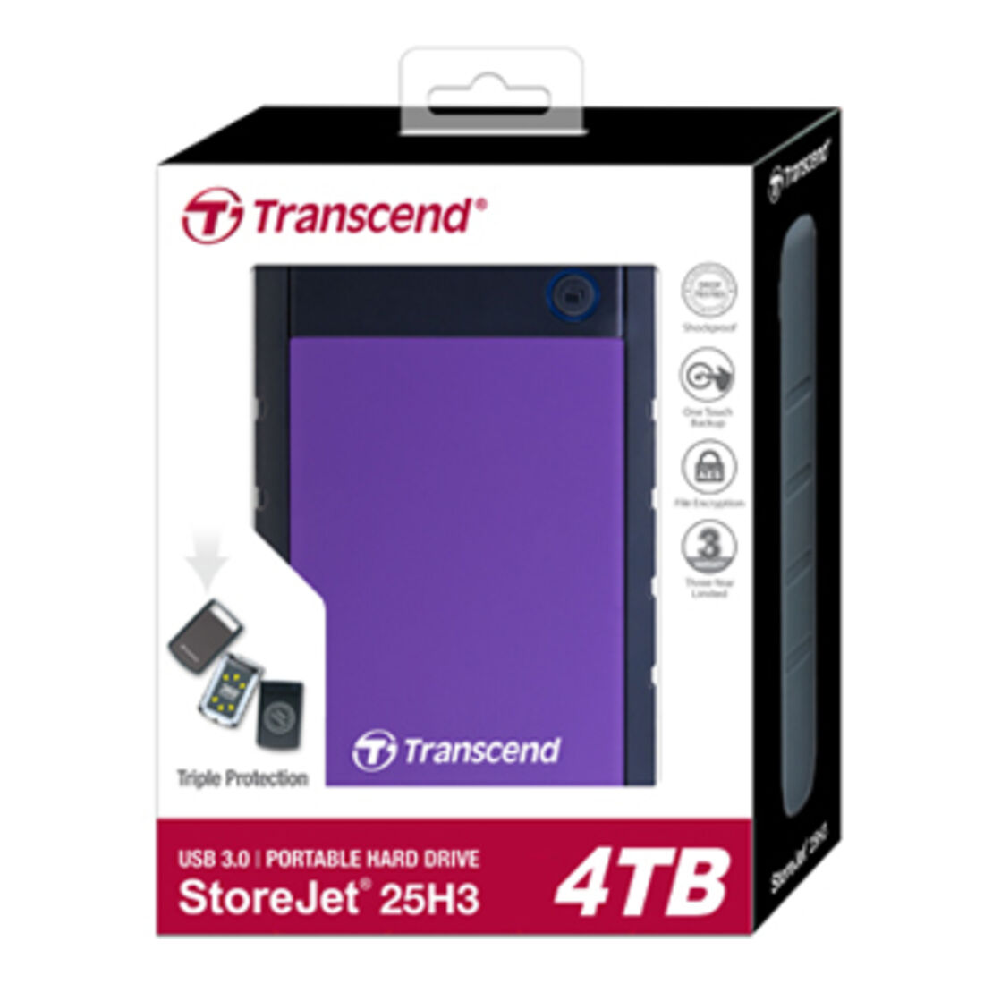 Transcend StoreJet 25H3. Capacità hard disk: 4 TB, Dimensione hard disk: 2.5″. Versione USB: 3.2 Gen 1 (3.1 Gen 1). Colore del prodotto: Nero, Viola
