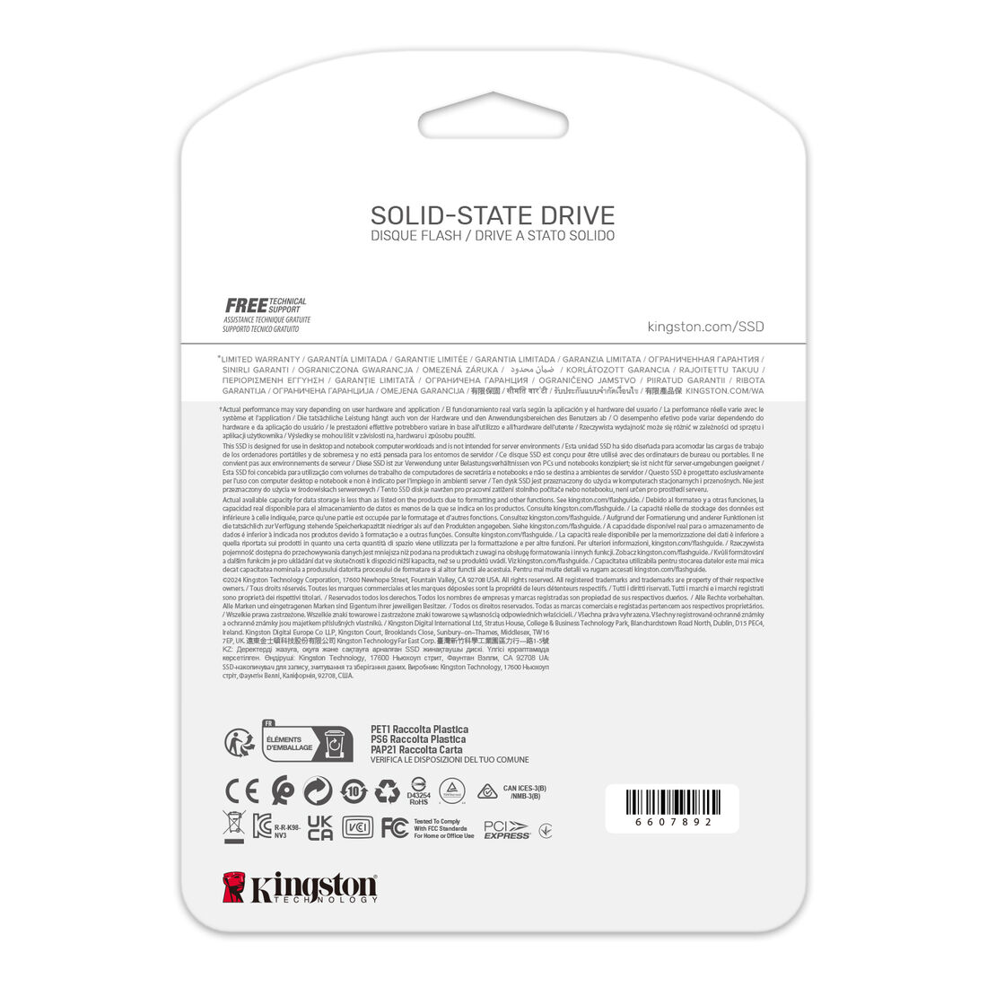 Kingston Technology 4000G NV3 M.2 2280 NVMe SSD. Capacità SSD: 4 TB, Dimensione SSD: M.2, Velocità di lettura: 6000 MB/s, Velocità di scrittura: 5000 MB/s, Componente per: PC/PC portatile