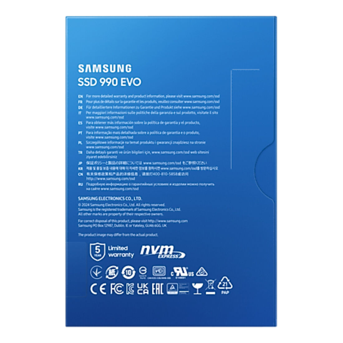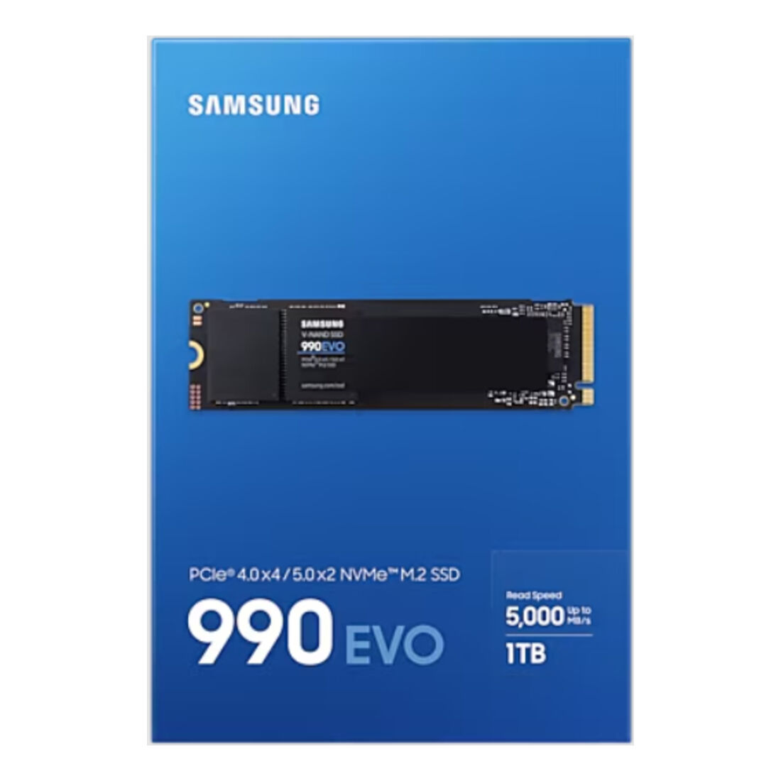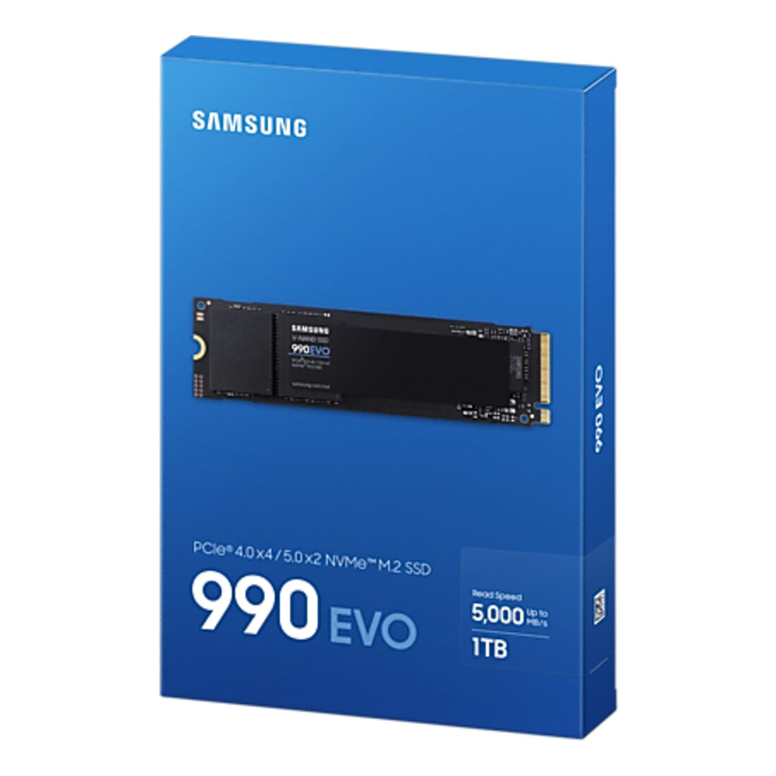 Samsung 990 EVO. Capacità SSD: 1 TB, Dimensione SSD: M.2, Velocità di lettura: 5000 MB/s, Velocità di scrittura: 4200 MB/s, Componente per: Universale