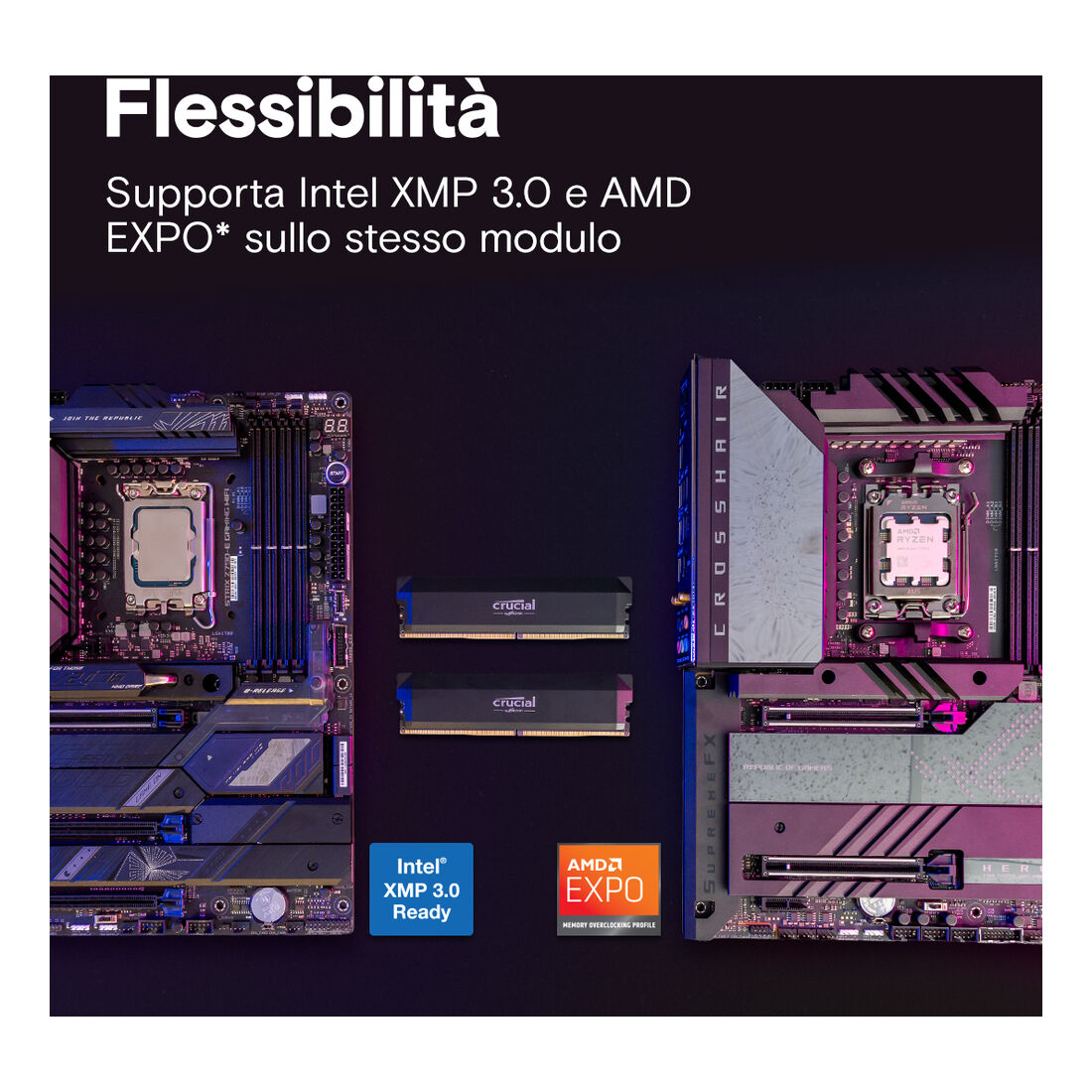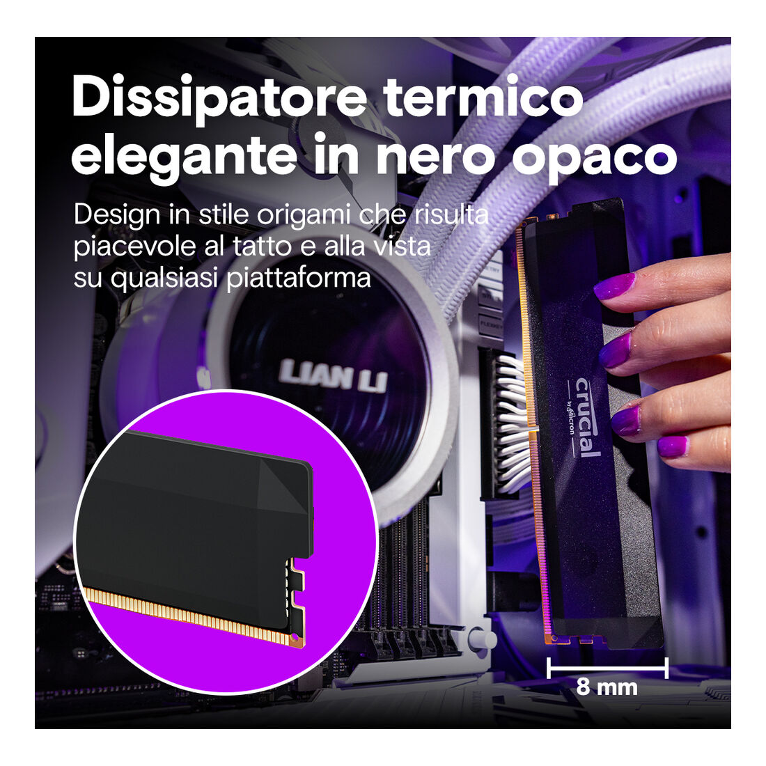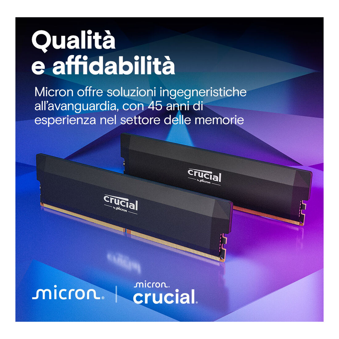 Crucial Pro CP2K32G60C40U5B. Componente per: PC, RAM installata: 64 GB, Configurazione della memoria (moduli x dimensione): 2 x 32 GB, Tipo di RAM: DDR5, Velocità memoria: 6000 MHz, Fattore di forma memoria: 288-pin DIMM, Latenza CAS: 40
