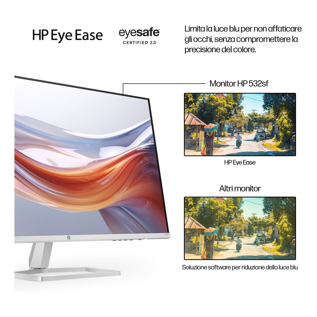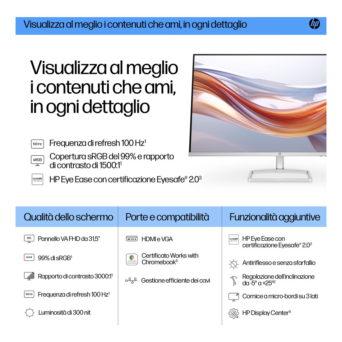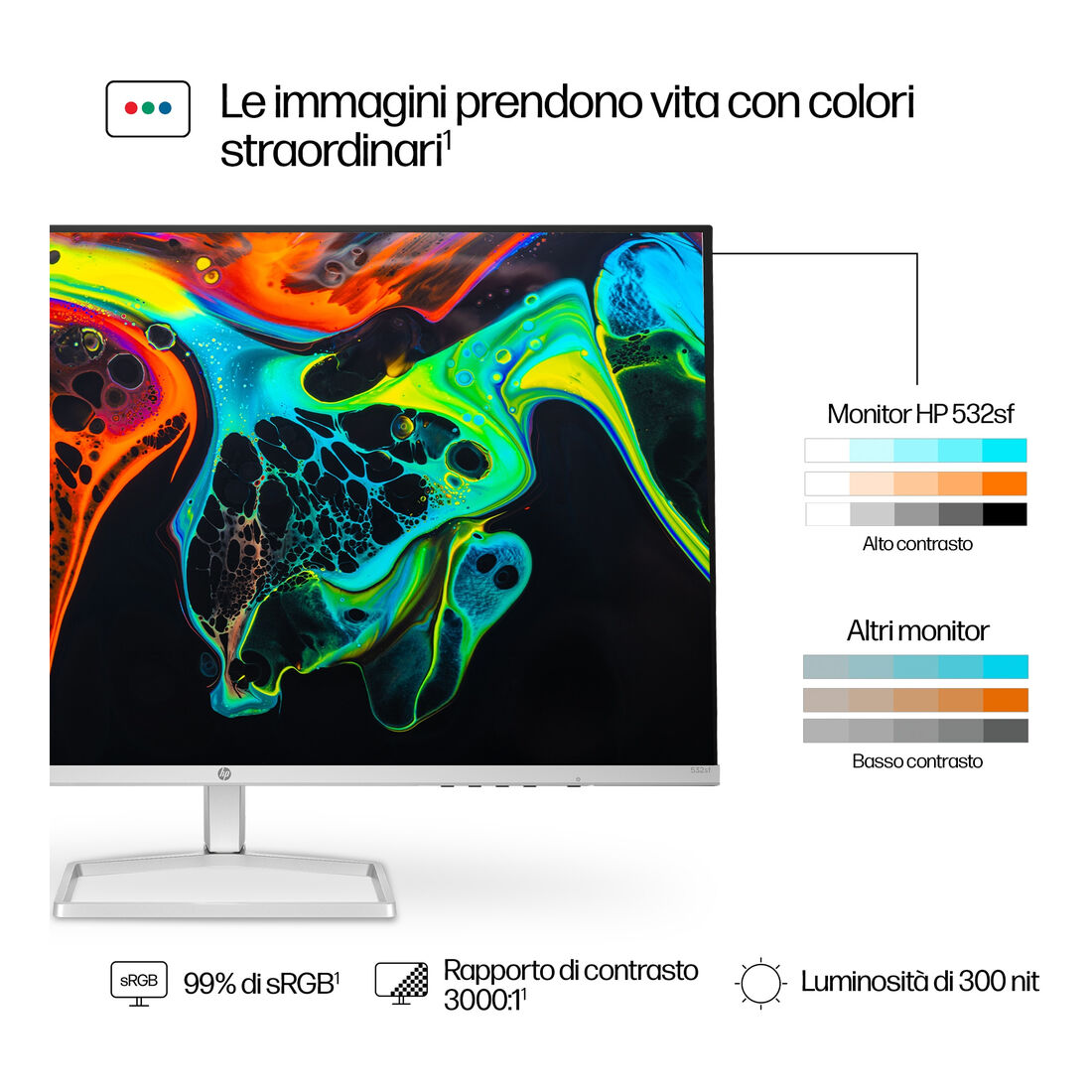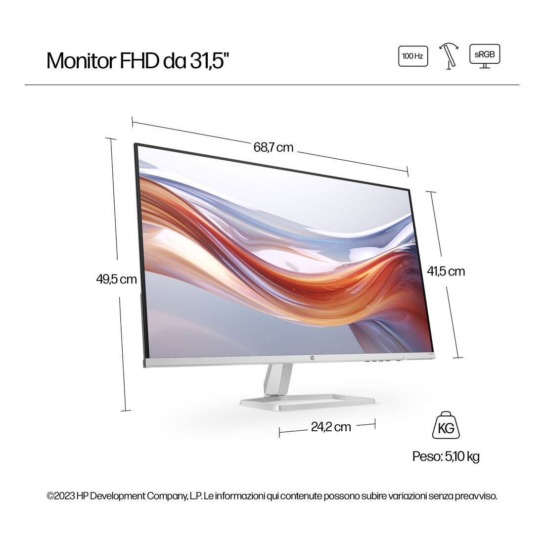 HP Series 5 Monitor Serie 5 31,5″ FHD – 532sf. Dimensioni diagonale schermo: 80 cm (31.5″), Risoluzione del display: 1920 x 1080 Pixel, Tipologia HD: Full HD, Tecnologia display: LCD, Superficie display: Opaco, Tempo di risposta: 7 ms, Rapporto d’aspetto nativo: 16:9, Angolo di visualizzazione (orizzontale): 178°, Angolo di visualizzazione (verticale): 178°. Colore del prodotto: Nero, Bianco