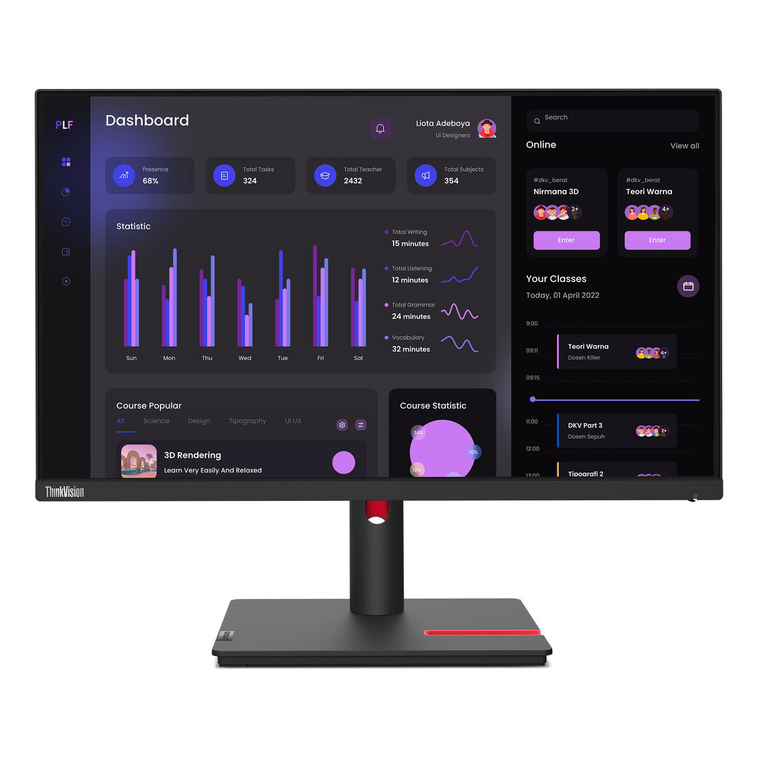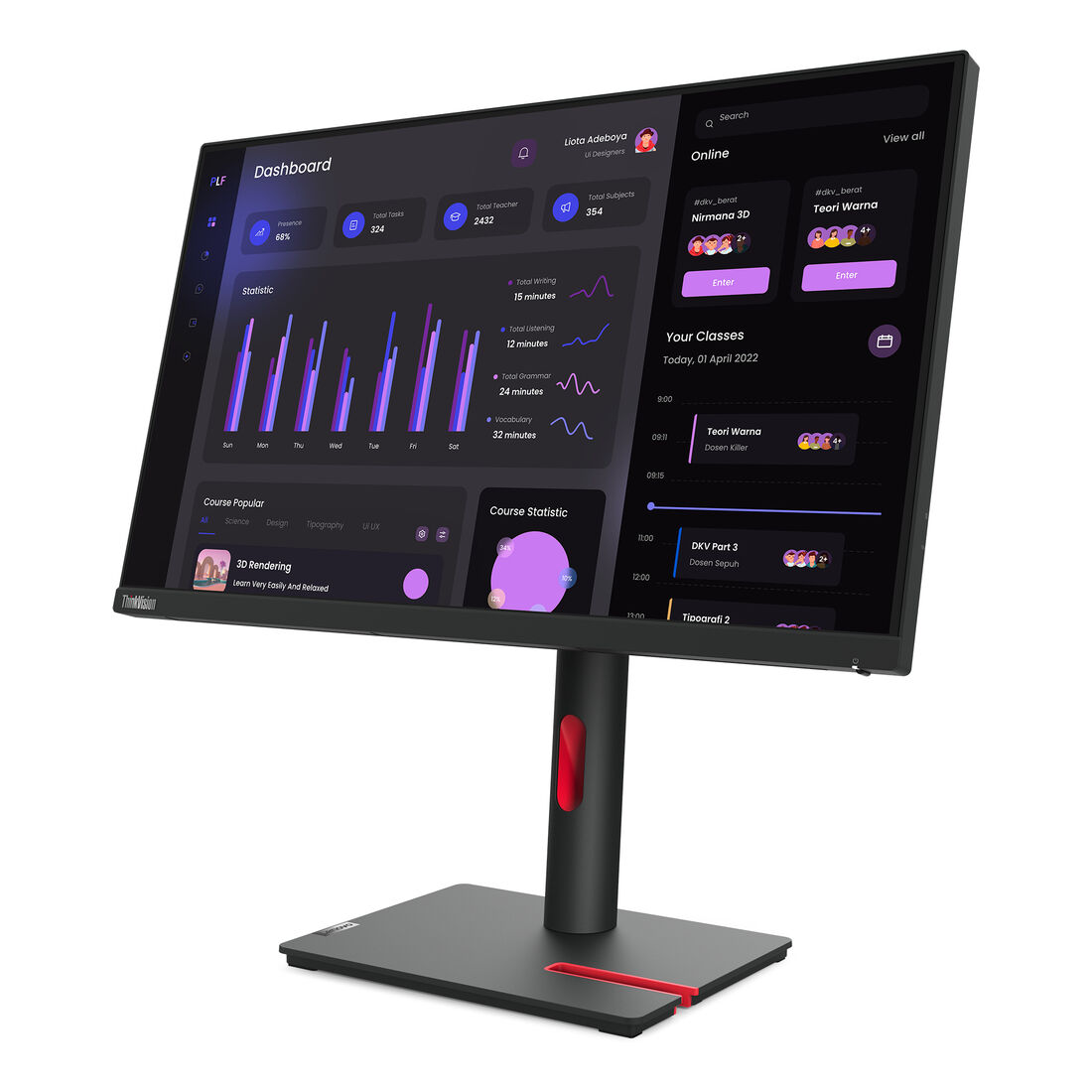 Lenovo ThinkVision T24i-30. Dimensioni diagonale schermo: 60,5 cm (23.8″), Risoluzione del display: 1920 x 1080 Pixel, Tipologia HD: Full HD, Tecnologia display: LED, Tempo di risposta: 6 ms, Rapporto d’aspetto nativo: 16:9, Angolo di visualizzazione (orizzontale): 178°, Angolo di visualizzazione (verticale): 178°. Hub USB integrato, Versione dell’hub USB: 3.2 Gen 1 (3.1 Gen 1). Montaggio standard VESA, Regolazione altezza. Colore del prodotto: Nero