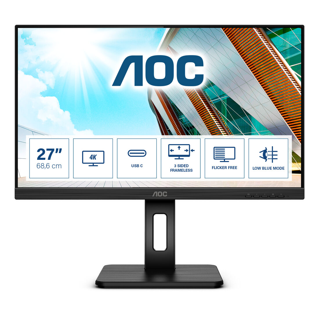 AOC U27P2CA. Dimensioni diagonale schermo: 68,6 cm (27″), Risoluzione del display: 3840 x 2160 Pixel, Tipologia HD: 4K Ultra HD, Tecnologia display: LED, Superficie display: Opaco, Tempo di risposta: 4 ms, Rapporto d’aspetto nativo: 16:9, Angolo di visualizzazione (orizzontale): 178°, Angolo di visualizzazione (verticale): 178°. Altoparlanti incorporati. Hub USB integrato, Versione dell’hub USB: 3.2 Gen 1 (3.1 Gen 1). Montaggio standard VESA, Regolazione altezza. Colore del prodotto: Nero