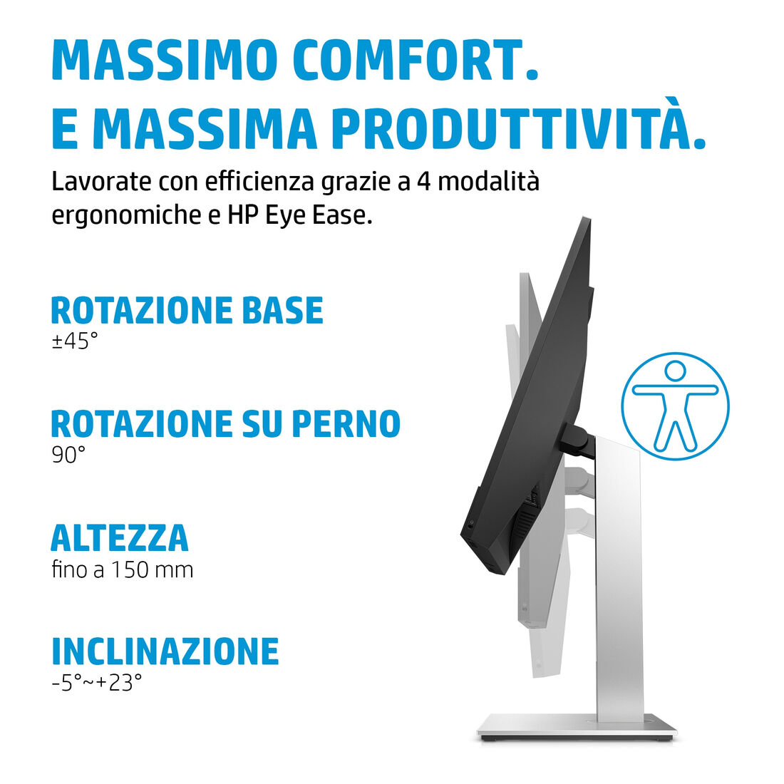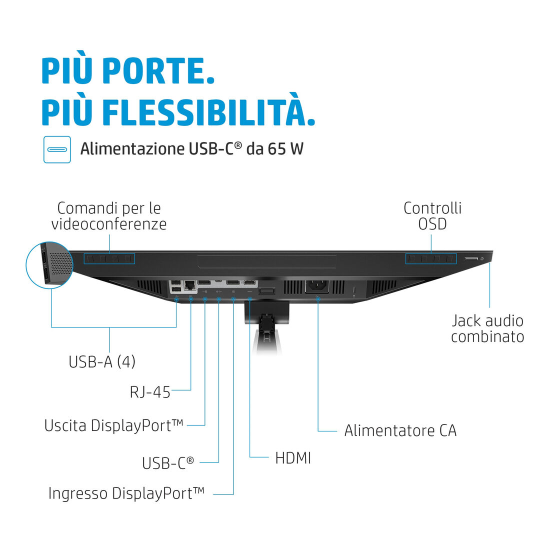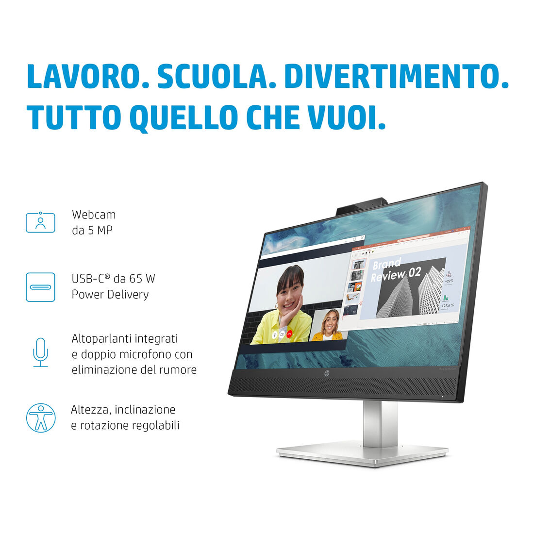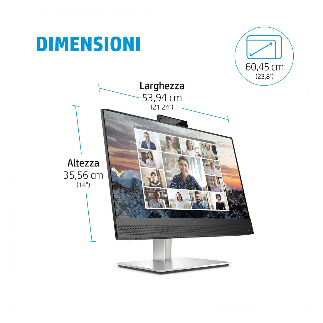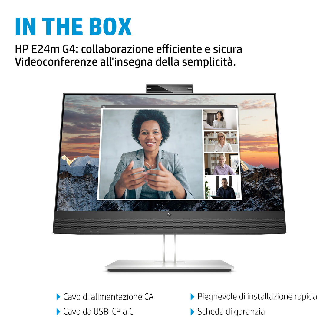 HP E24m G4 FHD USB-C Conferencing Monitor. Dimensioni diagonale schermo: 60,5 cm (23.8″), Risoluzione del display: 1920 x 1080 Pixel, Tipologia HD: Full HD, Tecnologia display: LCD, Superficie display: Opaco, Tempo di risposta: 5 ms, Rapporto d’aspetto nativo: 16:9, Angolo di visualizzazione (orizzontale): 178°, Angolo di visualizzazione (verticale): 178°. Altoparlanti incorporati. Hub USB integrato, Versione dell’hub USB: 3.2 Gen 1 (3.1 Gen 1). Montaggio standard VESA, Regolazione altezza. Colore del prodotto: Nero, Argento