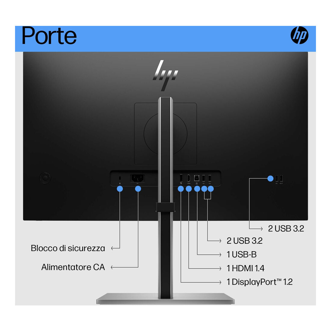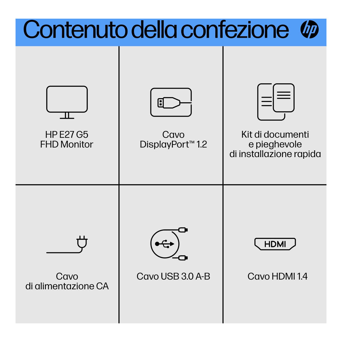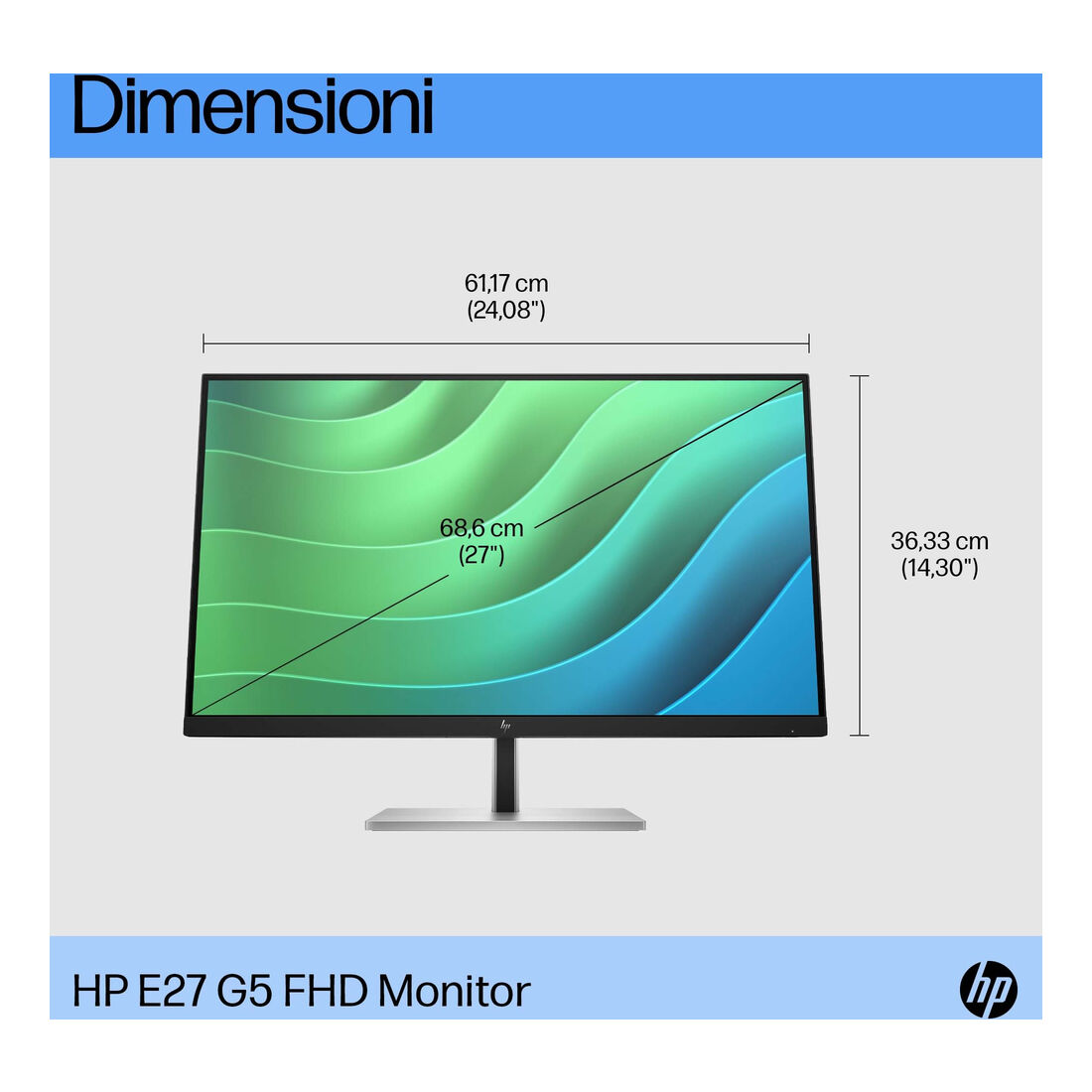 HP Monitor E27 G5 FHD. Dimensioni diagonale schermo: 68,6 cm (27″), Risoluzione del display: 1920 x 1080 Pixel, Tipologia HD: Full HD, Tecnologia display: LCD, Superficie display: Opaco, Tempo di risposta: 5 ms, Rapporto d’aspetto nativo: 16:9, Angolo di visualizzazione (orizzontale): 178°, Angolo di visualizzazione (verticale): 178°. Hub USB integrato, Versione dell’hub USB: 3.2 Gen 1 (3.1 Gen 1). Montaggio standard VESA, Regolazione altezza. Colore del prodotto: Nero