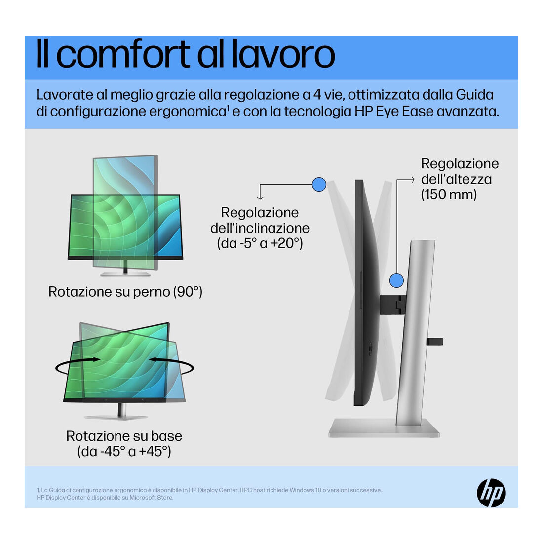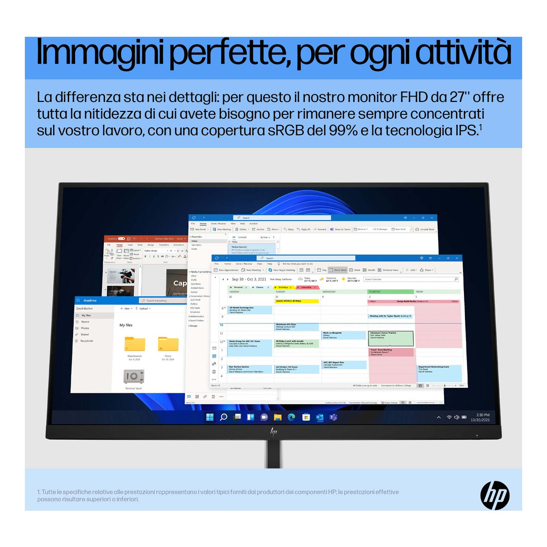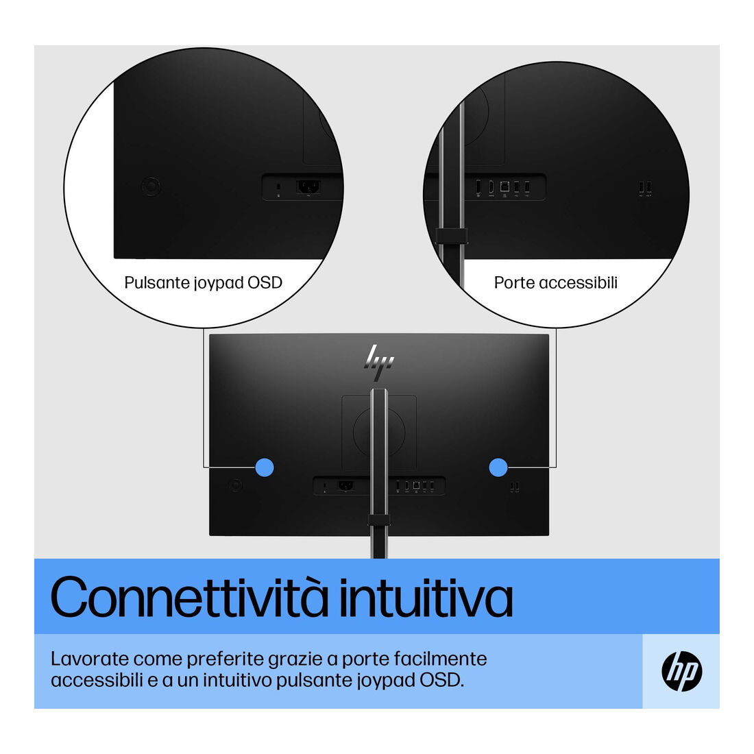 HP Monitor E27 G5 FHD. Dimensioni diagonale schermo: 68,6 cm (27″), Risoluzione del display: 1920 x 1080 Pixel, Tipologia HD: Full HD, Tecnologia display: LCD, Superficie display: Opaco, Tempo di risposta: 5 ms, Rapporto d’aspetto nativo: 16:9, Angolo di visualizzazione (orizzontale): 178°, Angolo di visualizzazione (verticale): 178°. Hub USB integrato, Versione dell’hub USB: 3.2 Gen 1 (3.1 Gen 1). Montaggio standard VESA, Regolazione altezza. Colore del prodotto: Nero