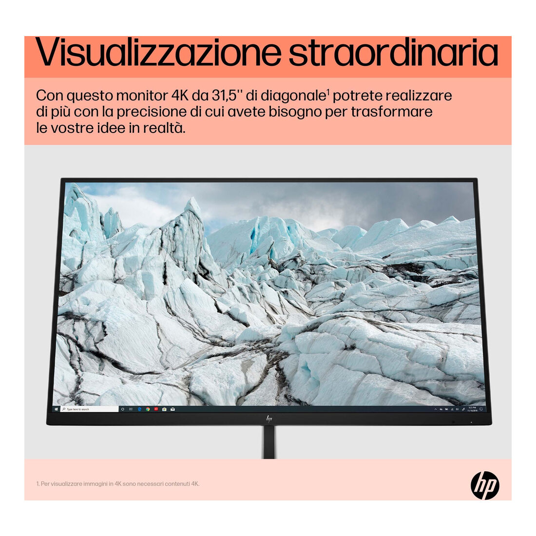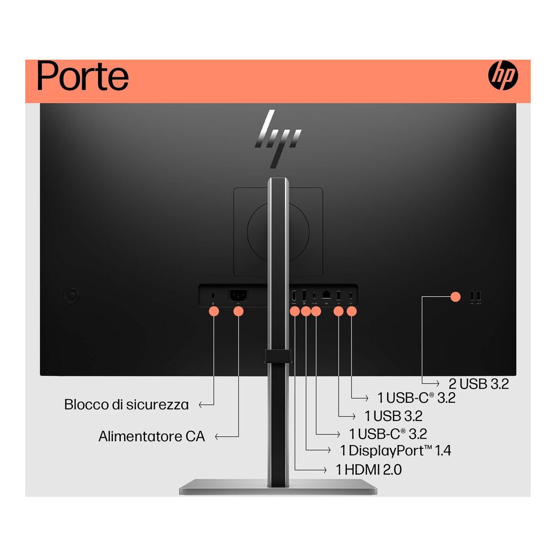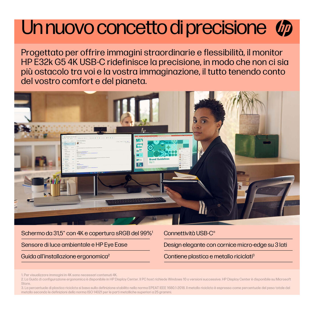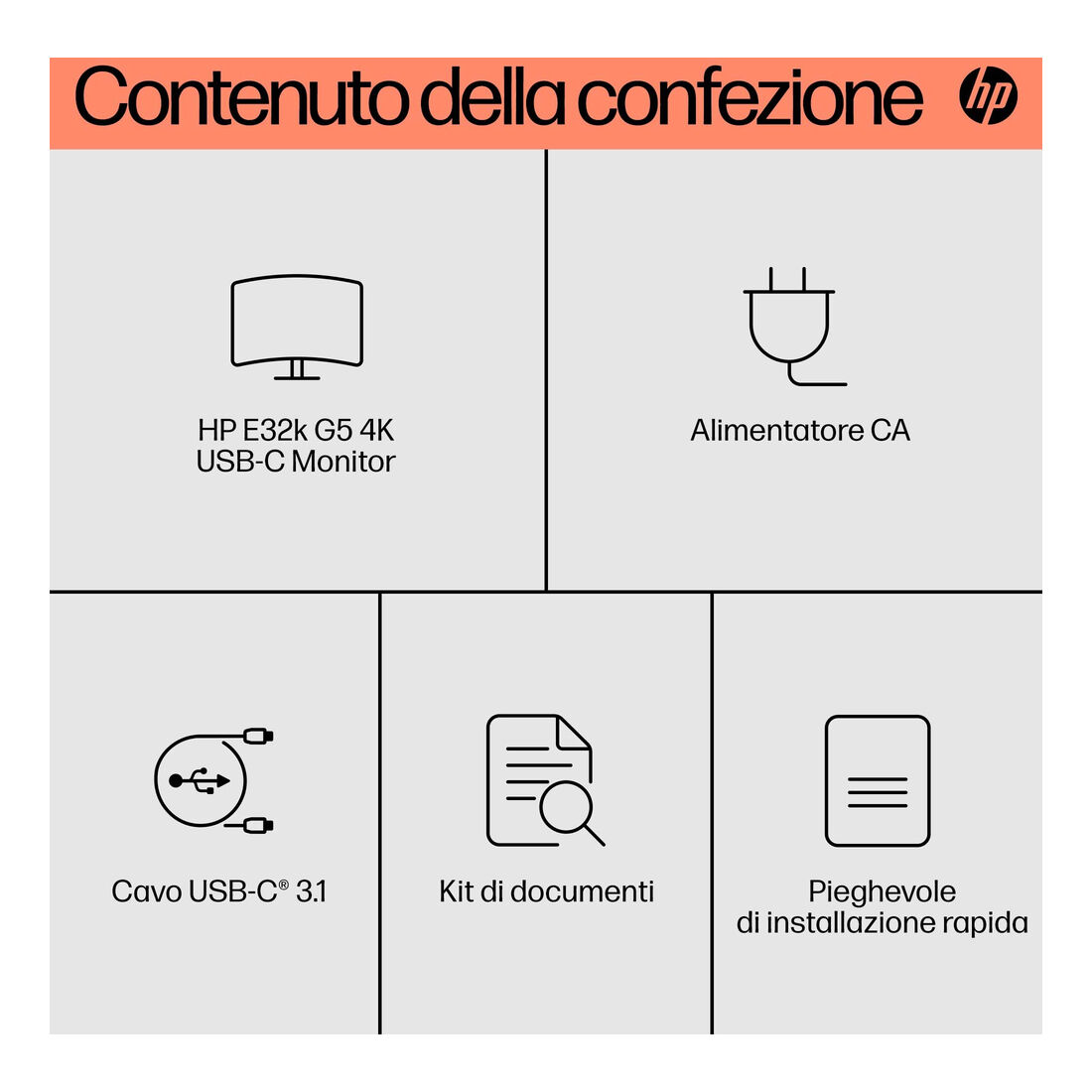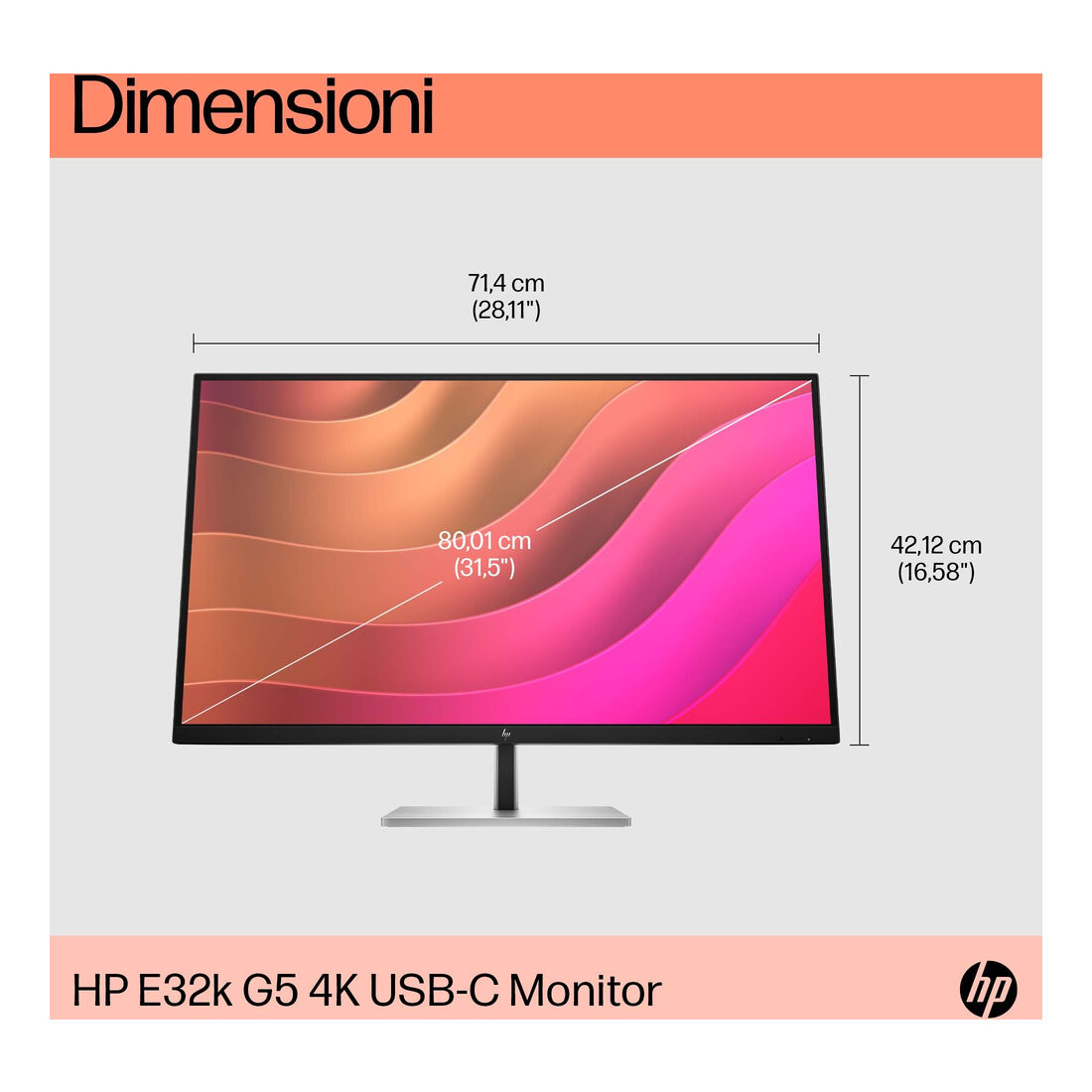 HP Monitor E32k G5 4K USB-C. Dimensioni diagonale schermo: 80 cm (31.5″), Risoluzione del display: 3840 x 2160 Pixel, Tipologia HD: 4K Ultra HD, Tecnologia display: LCD, Superficie display: Opaco, Tempo di risposta: 5 ms, Rapporto d’aspetto nativo: 16:9, Angolo di visualizzazione (orizzontale): 178°, Angolo di visualizzazione (verticale): 178°. Altoparlanti incorporati. Hub USB integrato, Versione dell’hub USB: 3.2 Gen 1 (3.1 Gen 1). Montaggio standard VESA, Regolazione altezza. Colore del prodotto: Nero
