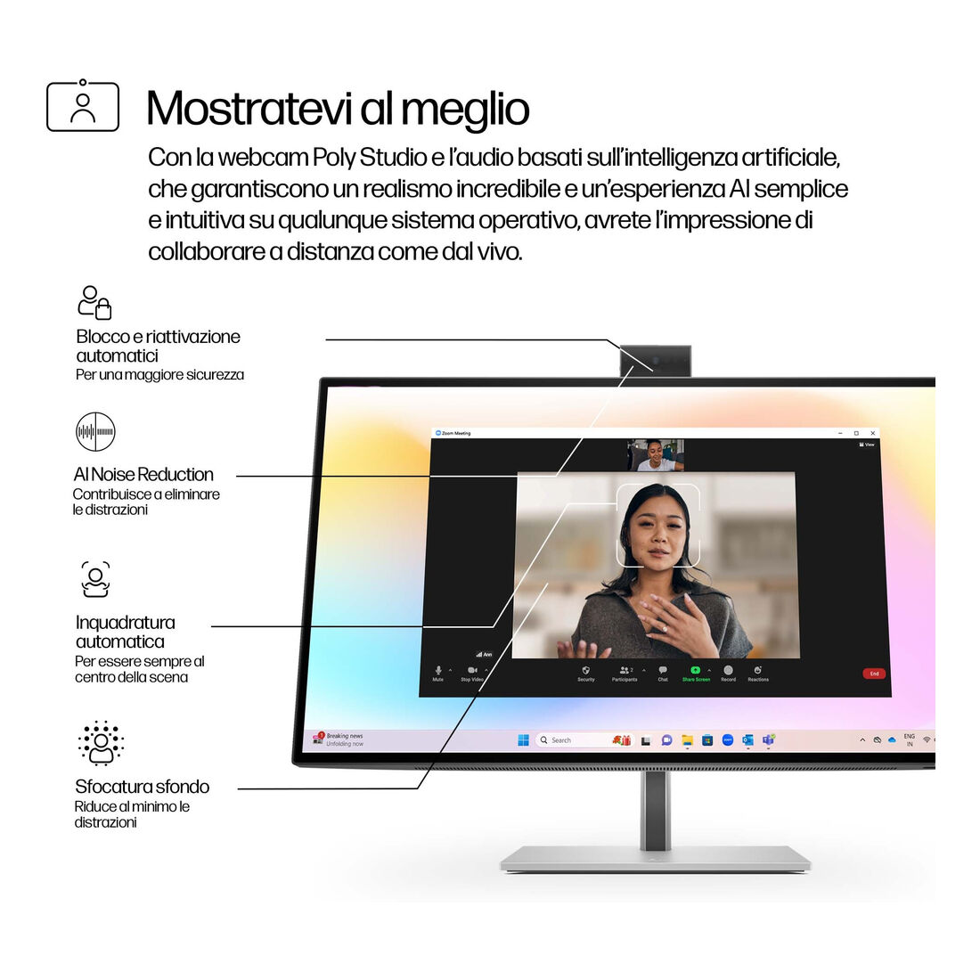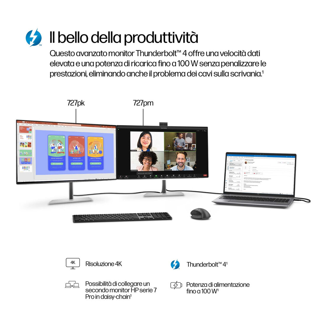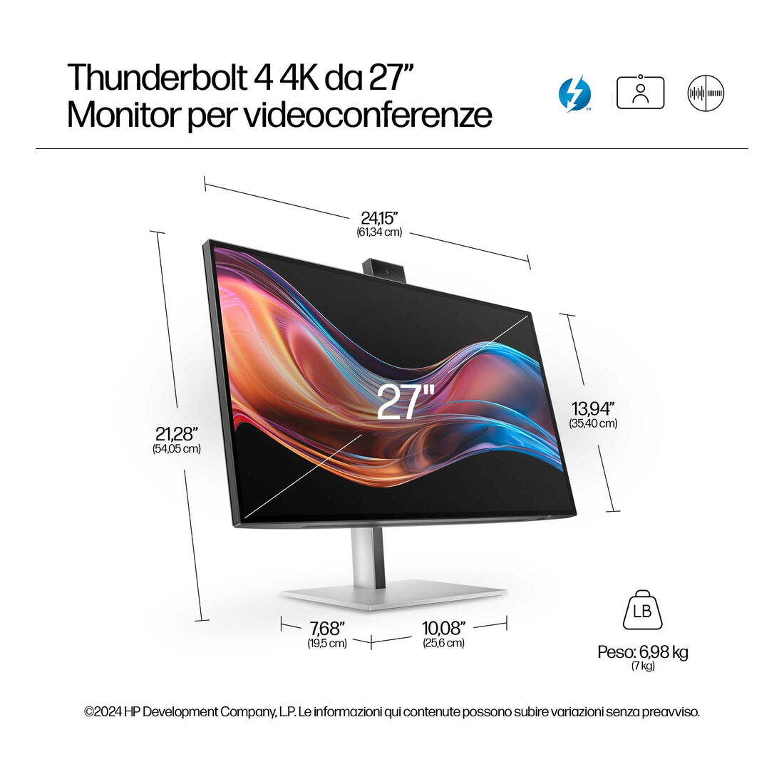 HP Monitor serie 7 Pro 4K per videoconferenze da 27” – 727pm. Dimensioni diagonale schermo: 68,6 cm (27″), Risoluzione del display: 3840 x 2160 Pixel, Tipologia HD: 4K Ultra HD, Tecnologia display: LCD, Superficie display: Opaco, Tempo di risposta: 5 ms, Rapporto d’aspetto nativo: 16:9, Angolo di visualizzazione (orizzontale): 178°, Angolo di visualizzazione (verticale): 178°. Altoparlanti incorporati. Hub USB integrato, Versione dell’hub USB: 3.2 Gen 2 (3.1 Gen 2). Montaggio standard VESA, Regolazione altezza. Colore del prodotto: Nero
