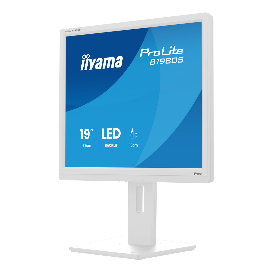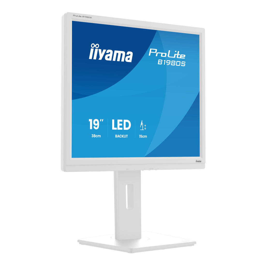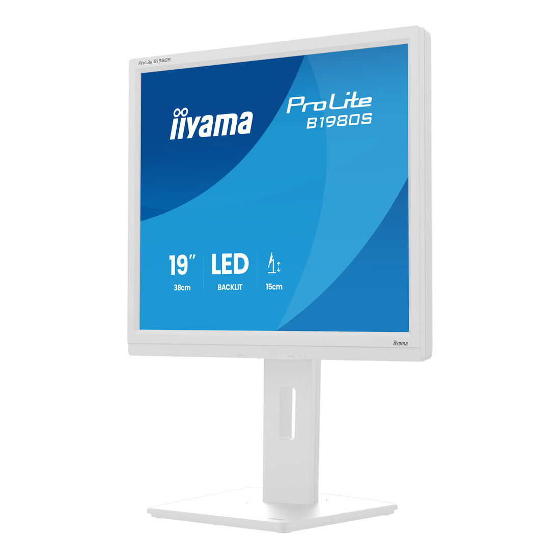 iiyama ProLite B1980S-W1. Dimensioni diagonale schermo: 48,3 cm (19″), Risoluzione del display: 1280 x 1024 Pixel, Tipologia HD: SVGA, Tecnologia display: LED, Tempo di risposta: 3 ms, Rapporto d’aspetto nativo: 5:4, Angolo di visualizzazione (orizzontale): 170°, Angolo di visualizzazione (verticale): 160°. Altoparlanti incorporati. Montaggio standard VESA, Regolazione altezza. Colore del prodotto: Bianco
