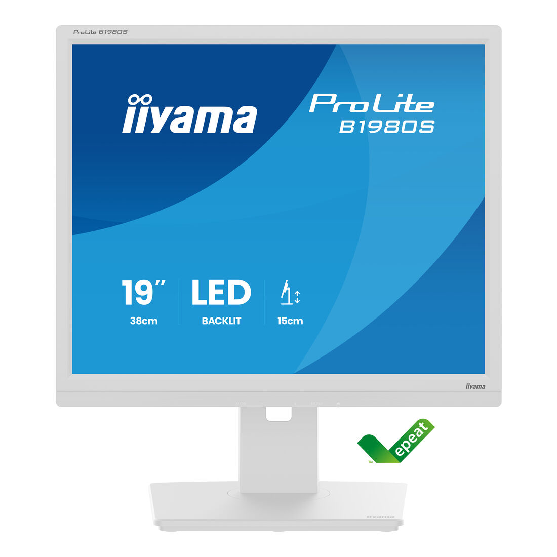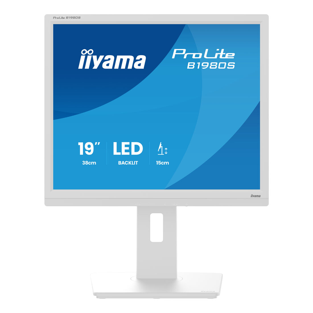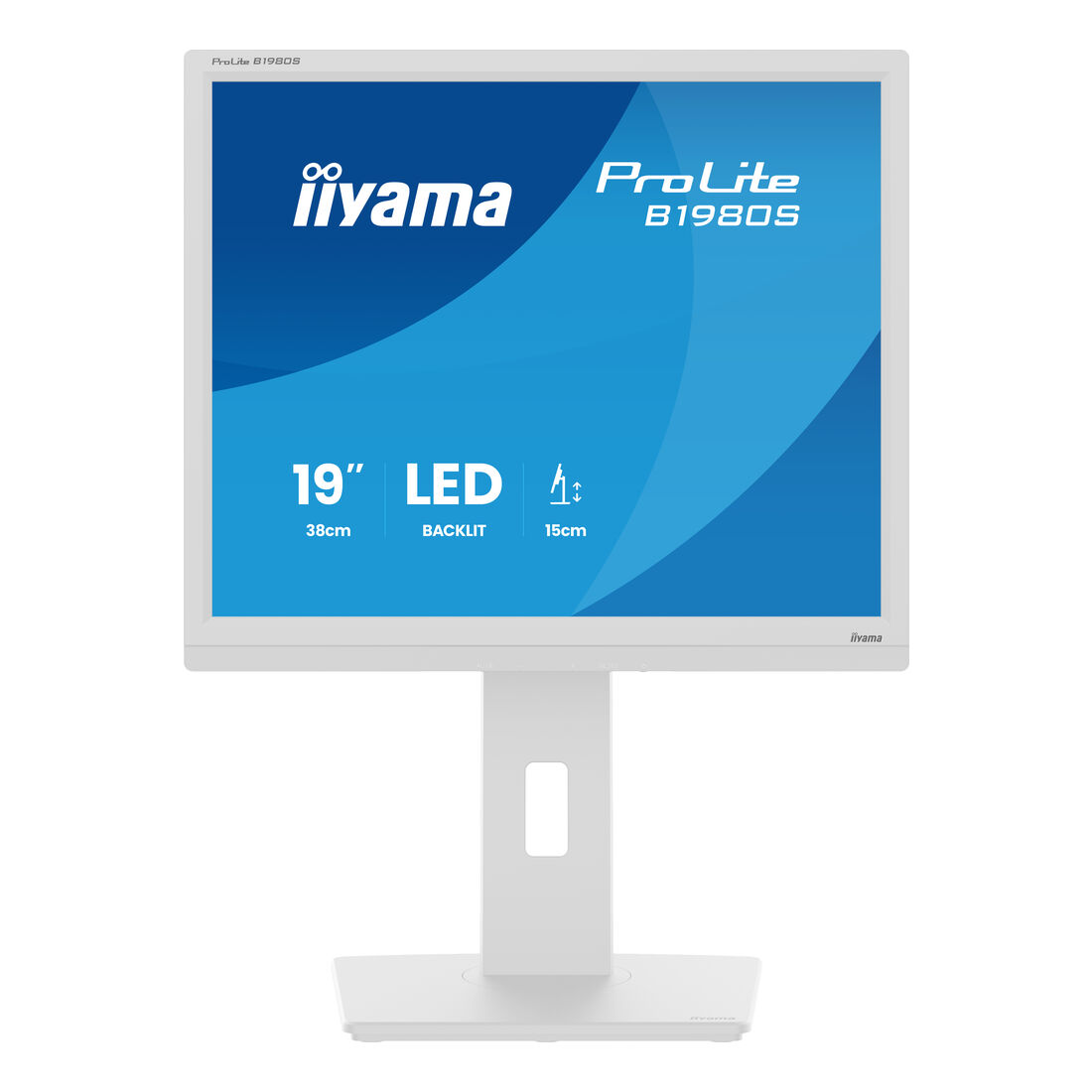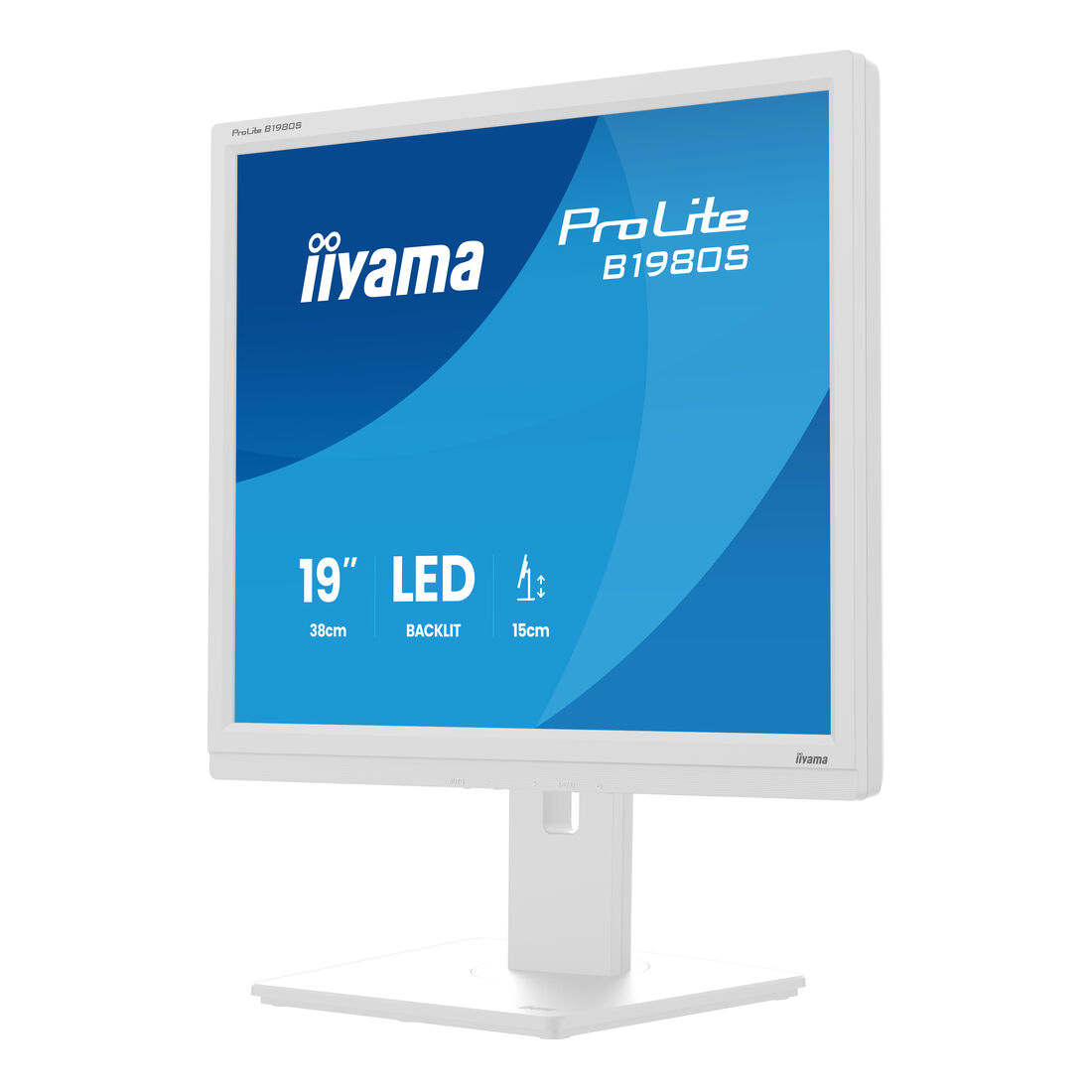 iiyama ProLite B1980S-W1. Dimensioni diagonale schermo: 48,3 cm (19″), Risoluzione del display: 1280 x 1024 Pixel, Tipologia HD: SVGA, Tecnologia display: LED, Tempo di risposta: 3 ms, Rapporto d’aspetto nativo: 5:4, Angolo di visualizzazione (orizzontale): 170°, Angolo di visualizzazione (verticale): 160°. Altoparlanti incorporati. Montaggio standard VESA, Regolazione altezza. Colore del prodotto: Bianco