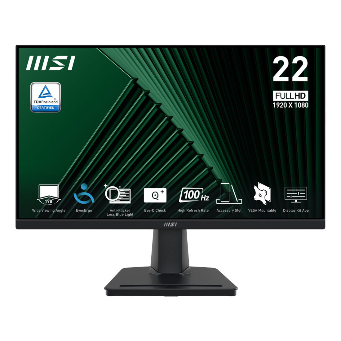 MSI Pro MP225V. Dimensioni diagonale schermo: 54,5 cm (21.4″), Risoluzione del display: 1920 x 1080 Pixel, Tipologia HD: Full HD, Tecnologia display: LCD, Tempo di risposta: 4 ms, Rapporto d’aspetto nativo: 16:9, Angolo di visualizzazione (orizzontale): 178°, Angolo di visualizzazione (verticale): 178°. Montaggio standard VESA. Colore del prodotto: Nero