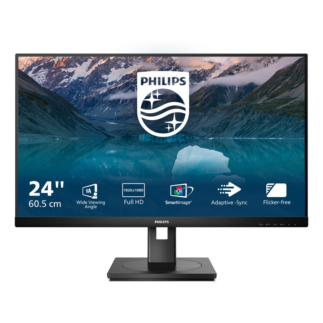Philips S Line 242S9JML/00. Dimensioni diagonale schermo: 61 cm (24″), Risoluzione del display: 1920 x 1080 Pixel, Tipologia HD: Full HD, Tecnologia display: LCD, Tempo di risposta: 4 ms, Rapporto d’aspetto nativo: 16:9, Angolo di visualizzazione (orizzontale): 178°, Angolo di visualizzazione (verticale): 178°. Altoparlanti incorporati. Hub USB integrato, Versione dell’hub USB: 3.2 Gen 1 (3.1 Gen 1). Montaggio standard VESA, Regolazione altezza. Colore del prodotto: Nero
