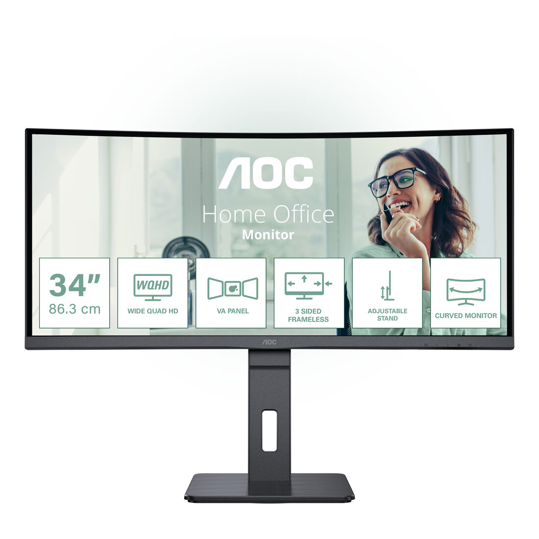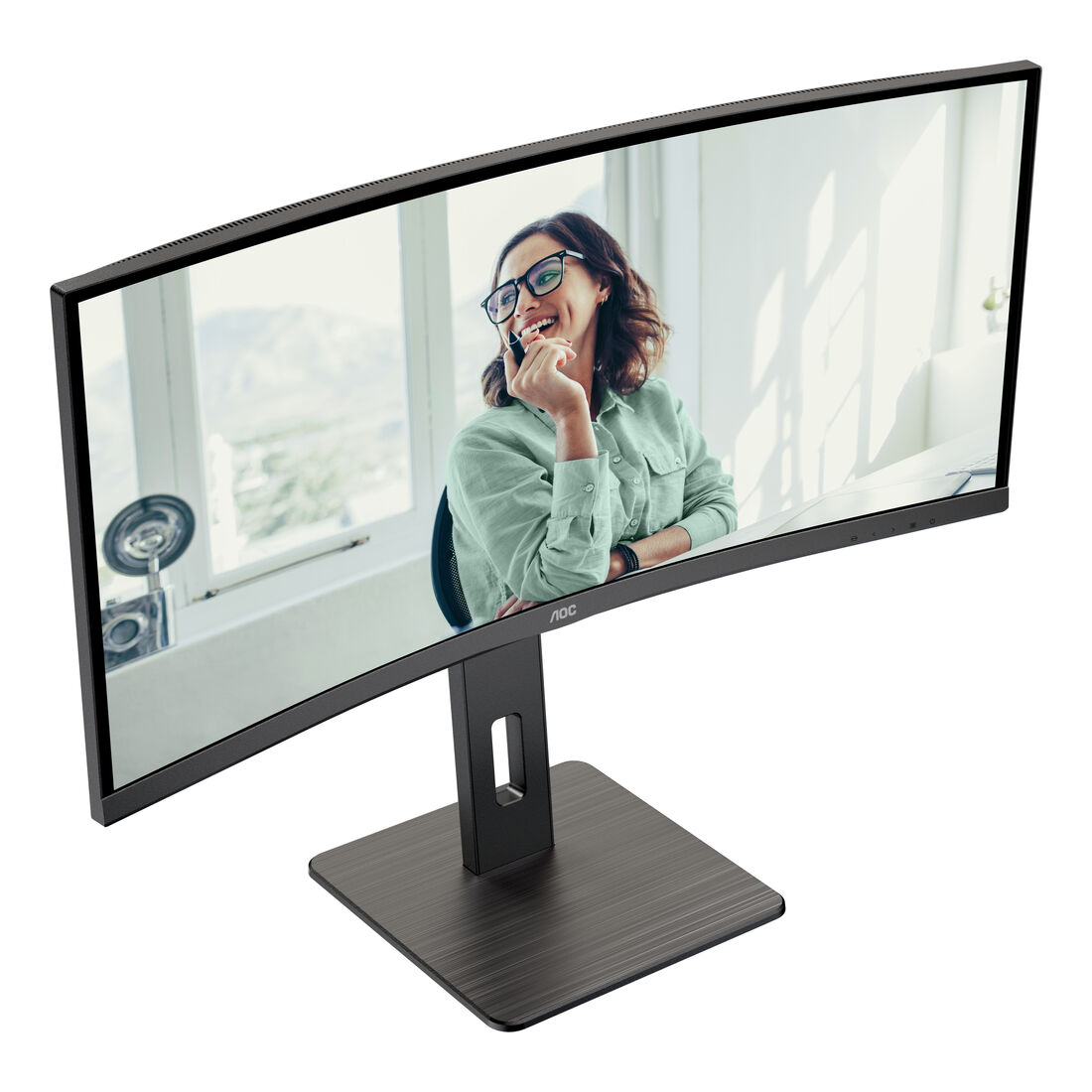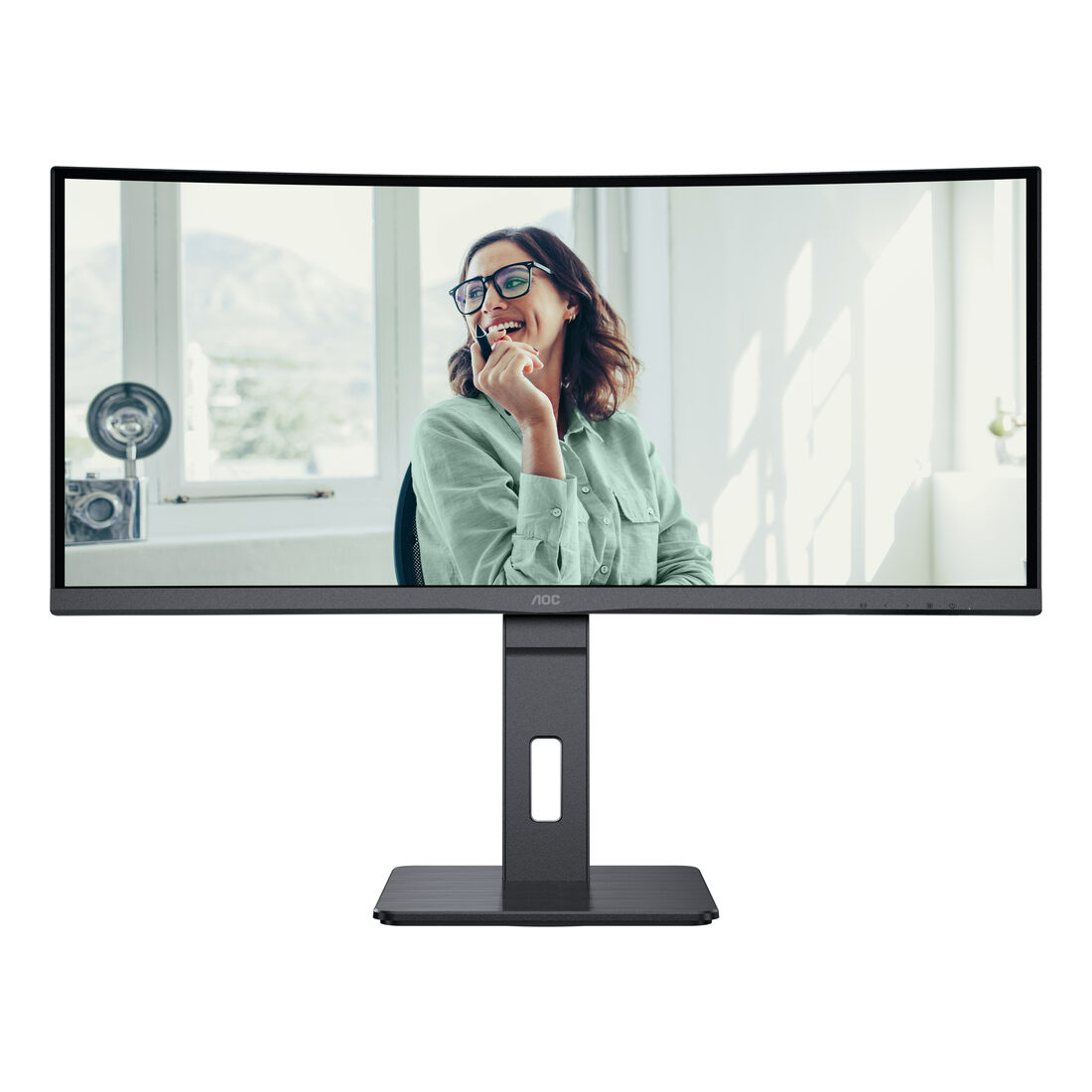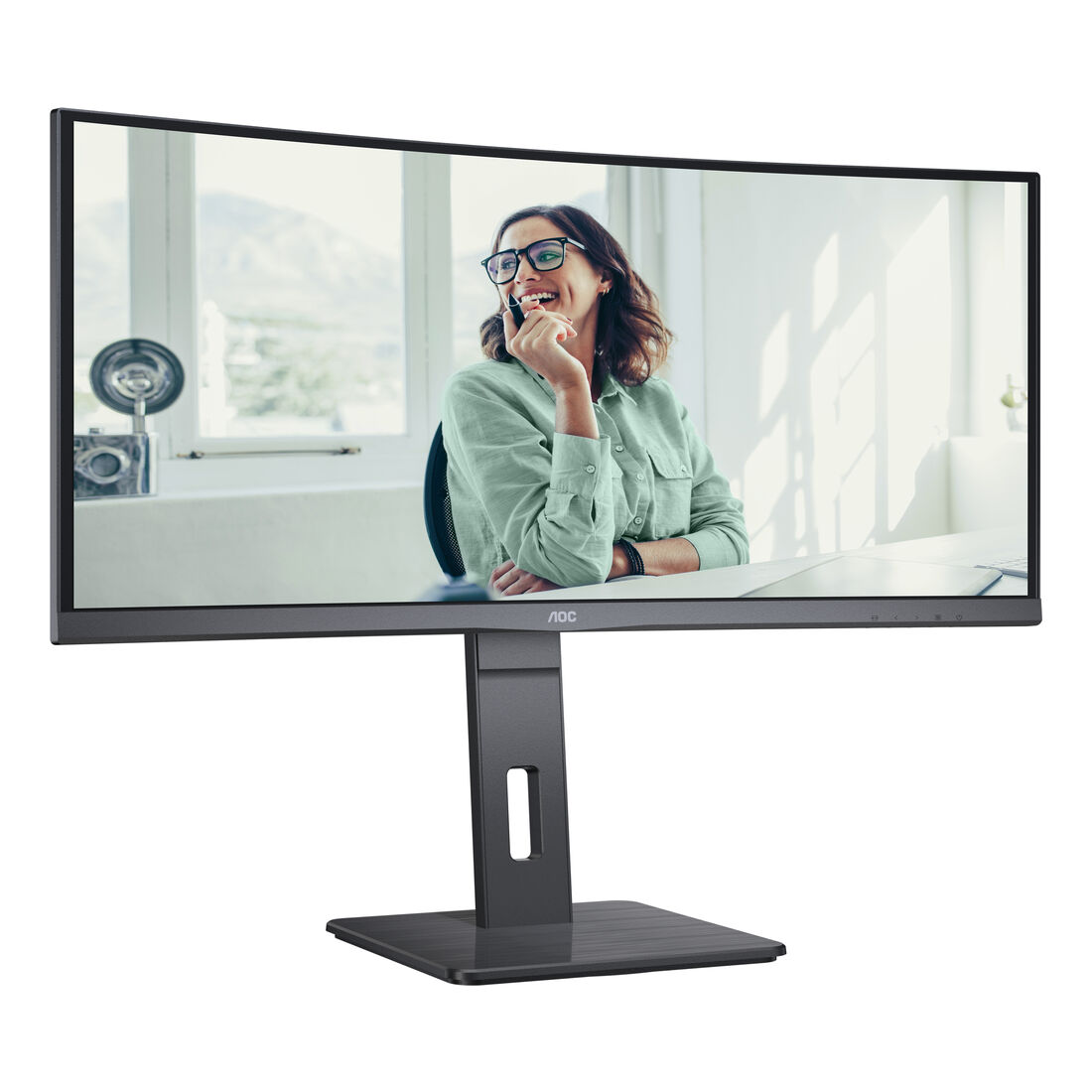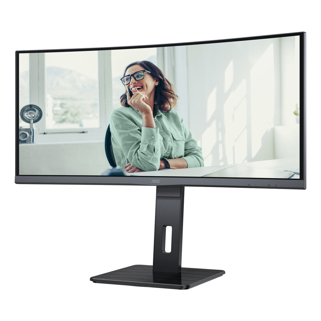 AOC CU34P3CV. Dimensioni diagonale schermo: 86,4 cm (34″), Risoluzione del display: 3440 x 1440 Pixel, Tipologia HD: UltraWide Quad HD, Tecnologia display: LED, Tempo di risposta: 4 ms, Rapporto d’aspetto nativo: 21:9, Angolo di visualizzazione (orizzontale): 178°, Angolo di visualizzazione (verticale): 178°. Altoparlanti incorporati. Hub USB integrato, Versione dell’hub USB: 3.2 Gen 1 (3.1 Gen 1). Montaggio standard VESA, Regolazione altezza. Colore del prodotto: Nero