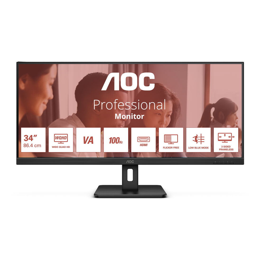 Screen size (inch) 34, Panel resolution 3440×1440, Refresh rate 100 Hz, Panel type VA, HDMI HDMI 2.0 x 2, Display Port DisplayPort 1.2 x 1, D-SUB (VGA) 0x, DVI 0x, Sync technology (VRR) Adaptive Sync