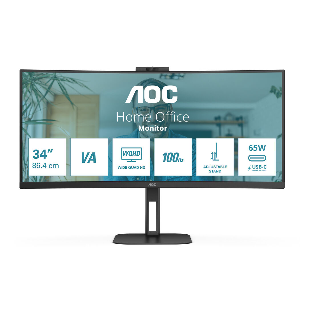 Screen size (inch) 34, Panel resolution 3440×1440, Refresh rate 100 Hz, Response time MPRT 1 ms, Panel type VA, USB-C connectivity USB-C 3.2 x 1 (DP alt mode, upstream, power delivery up to 65 W), HDMI HDMI 2.0 x 1, Display Port DisplayPort 1.2 x 1, D-SUB (VGA) 0x, DVI 0x, Sync technology (VRR) Freesync