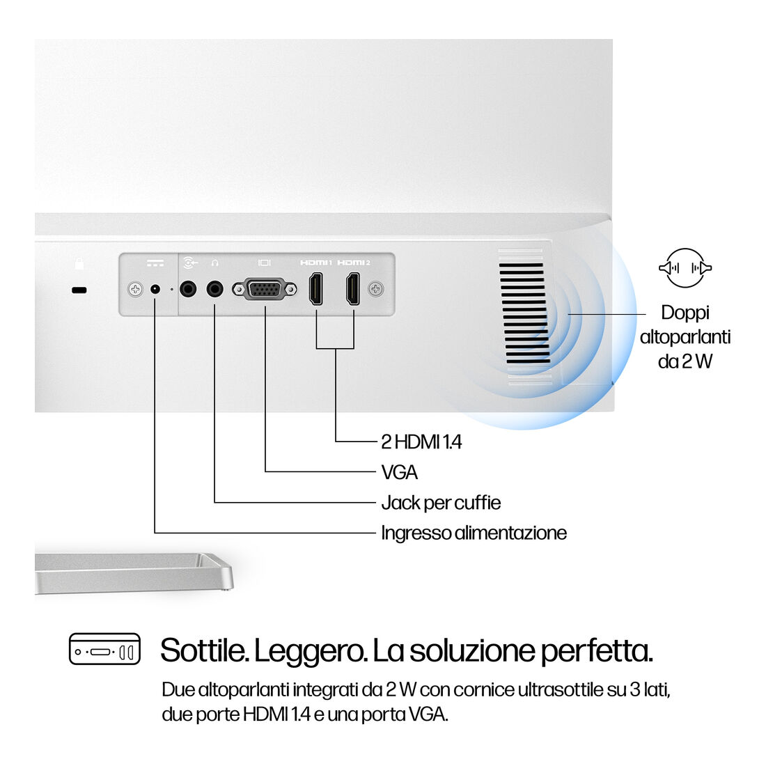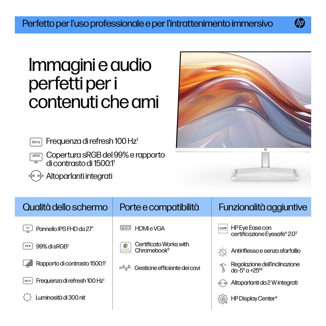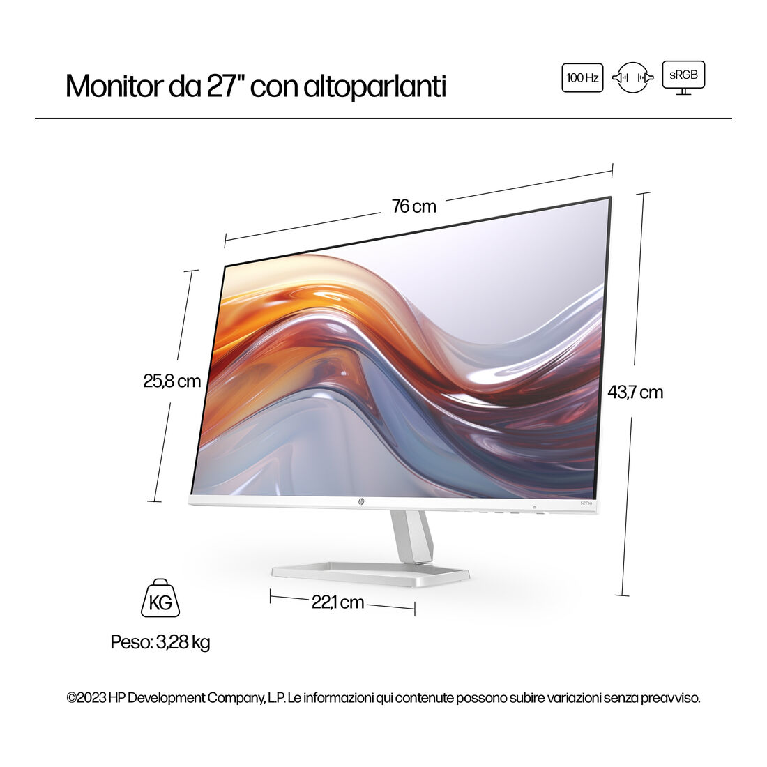 HP Series 5 27 inch FHD Monitor with Speakers – 527sa. Dimensioni diagonale schermo: 68,6 cm (27″), Risoluzione del display: 1920 x 1080 Pixel, Tipologia HD: Full HD, Tecnologia display: LCD, Superficie display: Opaco, Tempo di risposta: 5 ms, Rapporto d’aspetto nativo: 16:9, Angolo di visualizzazione (orizzontale): 178°, Angolo di visualizzazione (verticale): 178°. Altoparlanti incorporati. Colore del prodotto: Argento