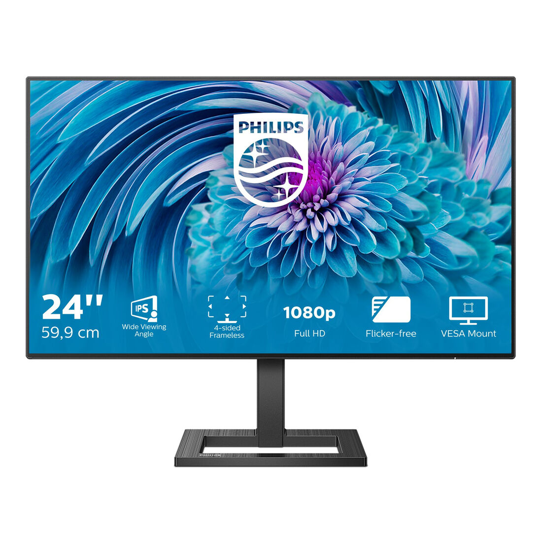 Philips E Line 241E2FD/00. Dimensioni diagonale schermo: 60,5 cm (23.8″), Risoluzione del display: 1920 x 1080 Pixel, Tipologia HD: Full HD, Tecnologia display: LED, Superficie display: Opaco, Tempo di risposta: 4 ms, Rapporto d’aspetto nativo: 16:9, Angolo di visualizzazione (orizzontale): 178°, Angolo di visualizzazione (verticale): 178°. Montaggio standard VESA. Colore del prodotto: Nero