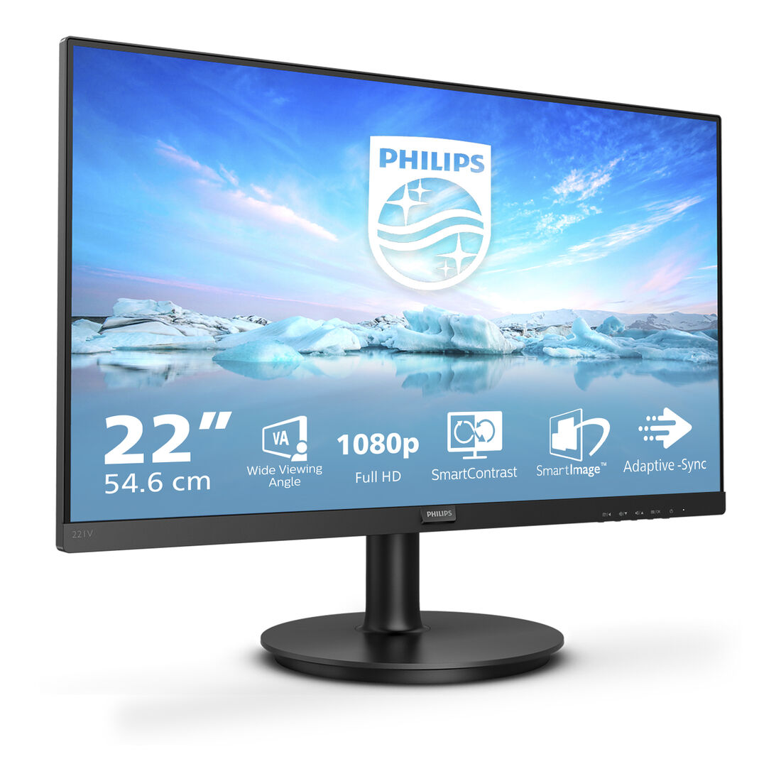 Philips V Line 221V8A/00. Dimensioni diagonale schermo: 54,6 cm (21.5″), Risoluzione del display: 1920 x 1080 Pixel, Tipologia HD: Full HD, Tecnologia display: LED, Superficie display: Lucida, Tempo di risposta: 4 ms, Rapporto d’aspetto nativo: 16:9, Angolo di visualizzazione (orizzontale): 178°, Angolo di visualizzazione (verticale): 178°. Altoparlanti incorporati. Montaggio standard VESA. Colore del prodotto: Nero