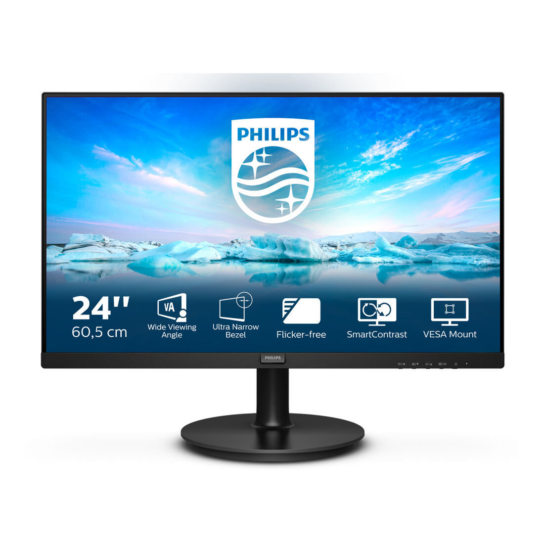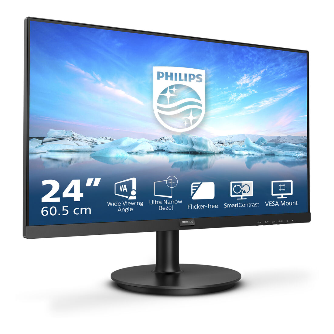 Philips V Line 241V8L/00. Dimensioni diagonale schermo: 60,5 cm (23.8″), Risoluzione del display: 1920 x 1080 Pixel, Tipologia HD: Full HD, Tecnologia display: LCD, Superficie display: Opaco, Tempo di risposta: 4 ms, Rapporto d’aspetto nativo: 16:9, Angolo di visualizzazione (orizzontale): 178°, Angolo di visualizzazione (verticale): 178°. Montaggio standard VESA. Colore del prodotto: Nero