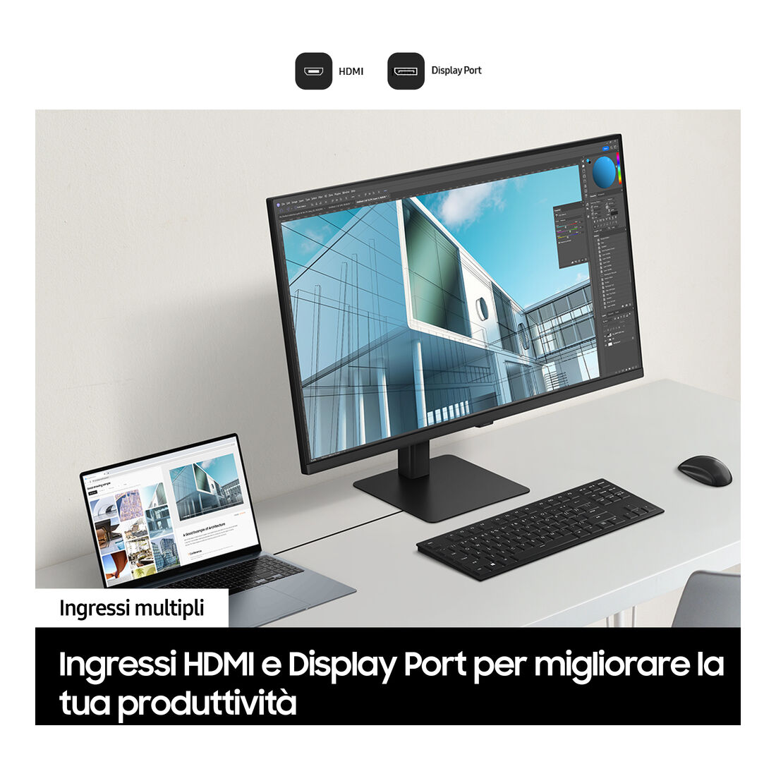 Samsung Monitor HRM ViewFinity S7 – S70D da 32” UHD Flat. Dimensioni diagonale schermo: 81,3 cm (32″), Risoluzione del display: 3840 x 2160 Pixel, Tipologia HD: 4K Ultra HD, Tecnologia display: LED, Tempo di risposta: 5 ms, Rapporto d’aspetto nativo: 16:9, Angolo di visualizzazione (orizzontale): 178°, Angolo di visualizzazione (verticale): 178°. Montaggio standard VESA. Colore del prodotto: Nero
