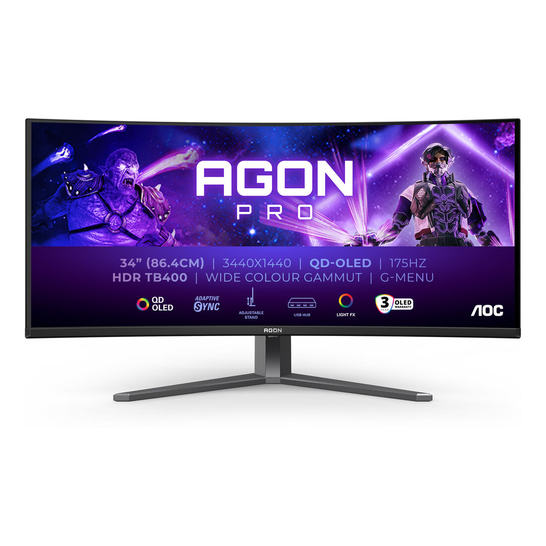 AOC AGON PRO AG346UCD. Dimensioni diagonale schermo: 86,4 cm (34″), Risoluzione del display: 3440 x 1440 Pixel, Tipologia HD: Wide Quad HD, Tecnologia display: QD-OLED, Tempo di risposta: 0,03 ms, Rapporto d’aspetto nativo: 21:9, Angolo di visualizzazione (orizzontale): 178°, Angolo di visualizzazione (verticale): 178°. Altoparlanti incorporati. Hub USB integrato, Versione dell’hub USB: 3.2 Gen 1 (3.1 Gen 1). Montaggio standard VESA, Regolazione altezza. Colore del prodotto: Nero, Grigio