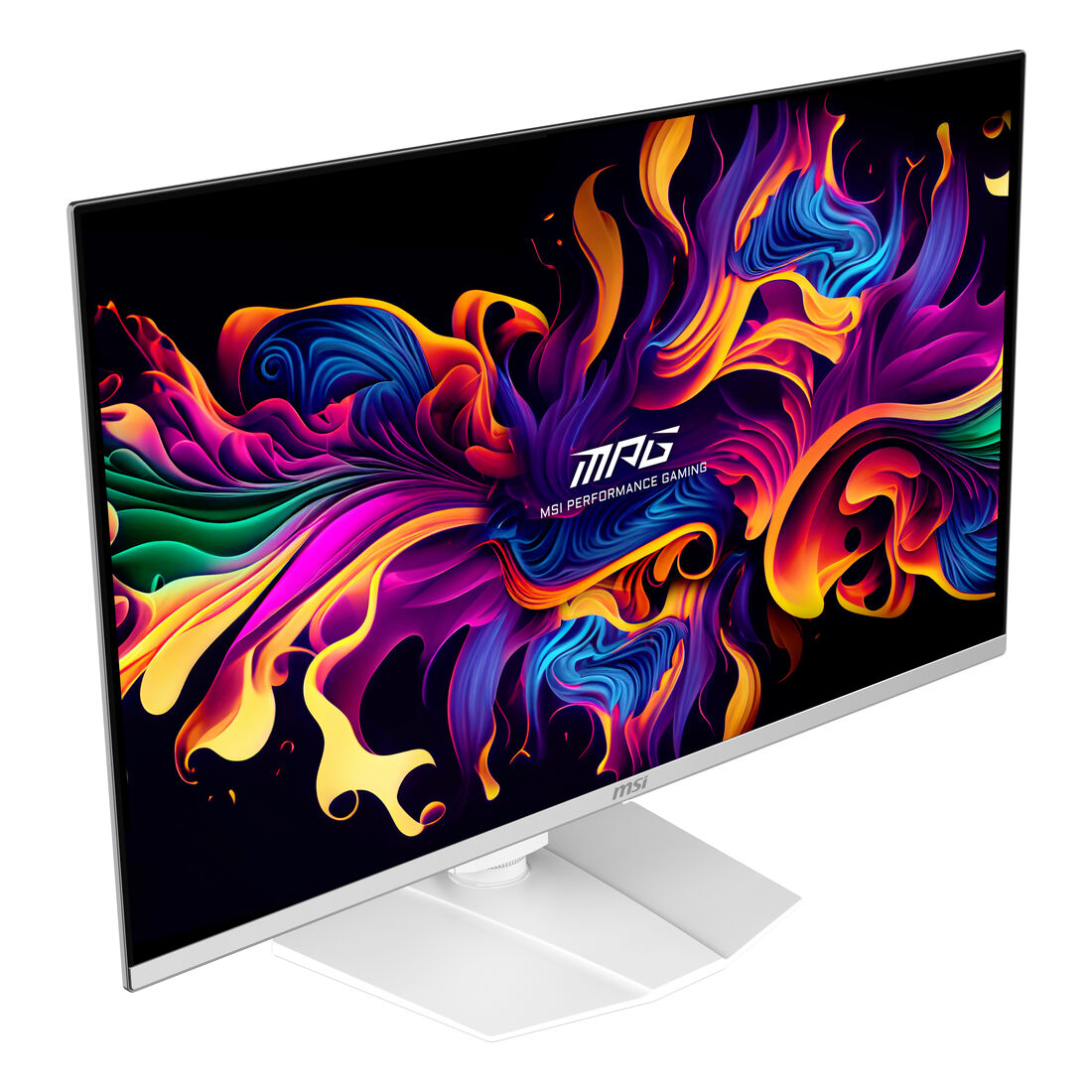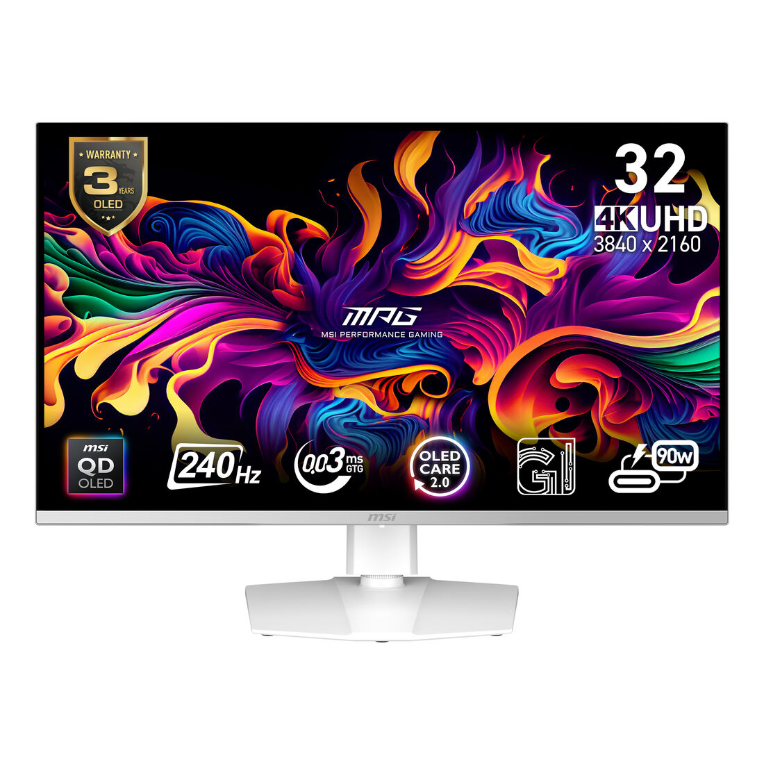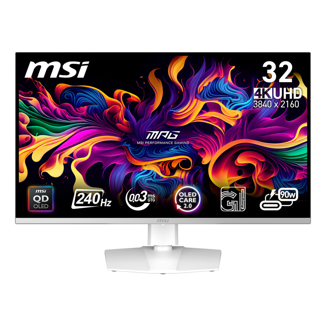 MSI MPG 321URXW QD-OLED. Dimensioni diagonale schermo: 80 cm (31.5″), Risoluzione del display: 3840 x 2160 Pixel, Tipologia HD: 4K Ultra HD, Tecnologia display: QD-OLED, Tempo di risposta: 0,03 ms, Rapporto d’aspetto nativo: 16:9, Angolo di visualizzazione (orizzontale): 178°, Angolo di visualizzazione (verticale): 178°. Hub USB integrato. Montaggio standard VESA, Regolazione altezza. Colore del prodotto: Bianco
