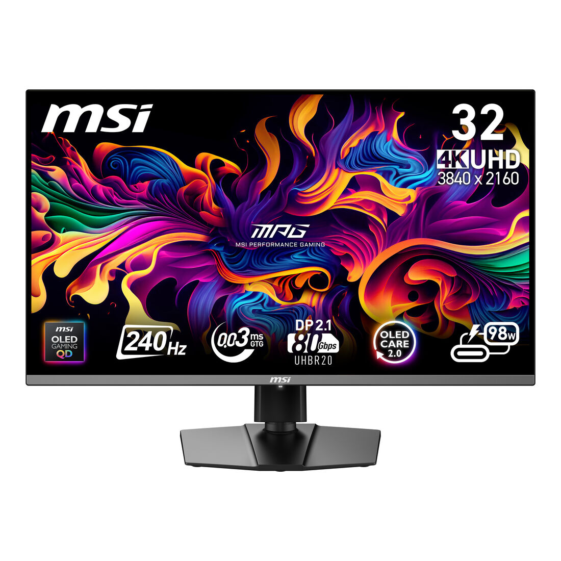 MSI MPG 322URX QD-OLED. Dimensioni diagonale schermo: 80 cm (31.5″), Risoluzione del display: 3840 x 2160 Pixel, Tipologia HD: 4K Ultra HD, Tecnologia display: QD-OLED, Tempo di risposta: 0,03 ms, Rapporto d’aspetto nativo: 16:9, Angolo di visualizzazione (orizzontale): 178°, Angolo di visualizzazione (verticale): 178°. Hub USB integrato. Montaggio standard VESA, Regolazione altezza. Colore del prodotto: Nero