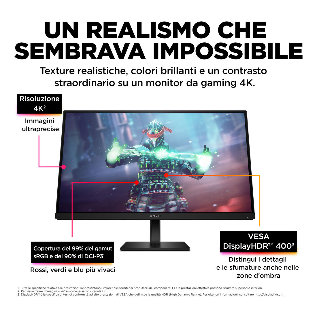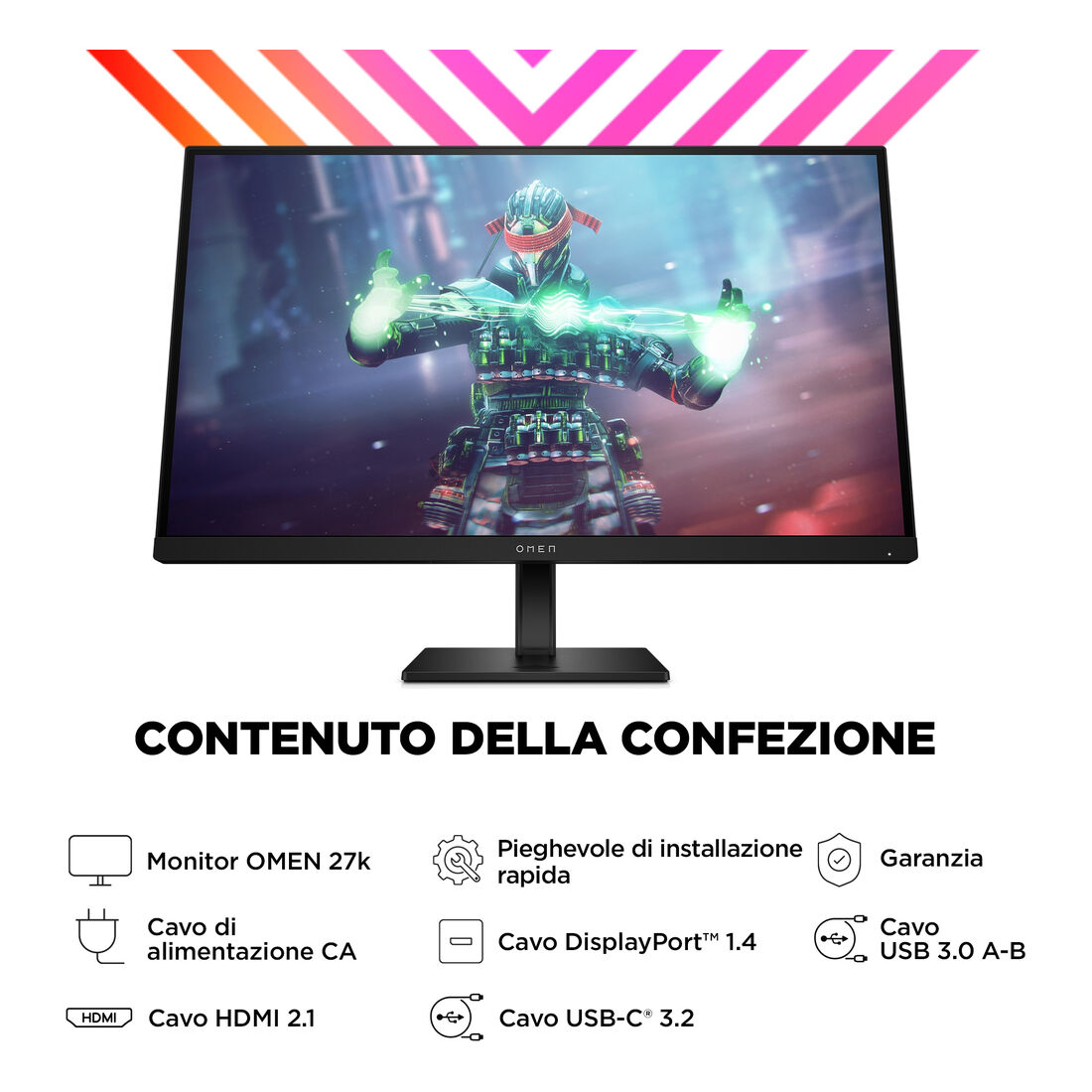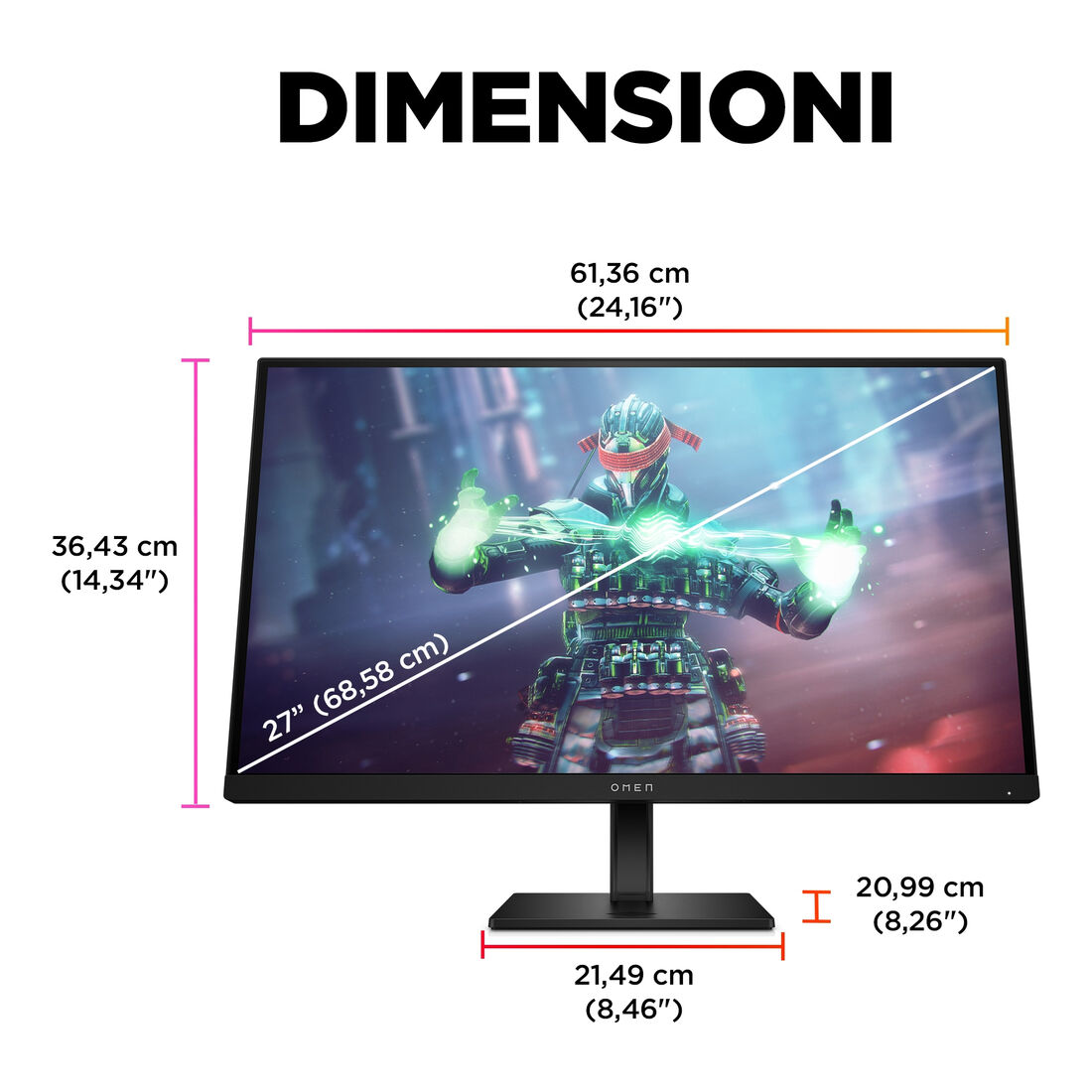 OMEN by HP Monitor da gaming OMEN by 27″ UHD 144 Hz – OMEN 27k. Dimensioni diagonale schermo: 68,6 cm (27″), Risoluzione del display: 3840 x 2160 Pixel, Tipologia HD: 4K Ultra HD, Tecnologia display: LCD, Superficie display: Opaco, Tempo di risposta: 1 ms, Rapporto d’aspetto nativo: 16:9, Angolo di visualizzazione (orizzontale): 178°, Angolo di visualizzazione (verticale): 178°. Altoparlanti incorporati. Hub USB integrato. Montaggio standard VESA, Regolazione altezza. Colore del prodotto: Nero