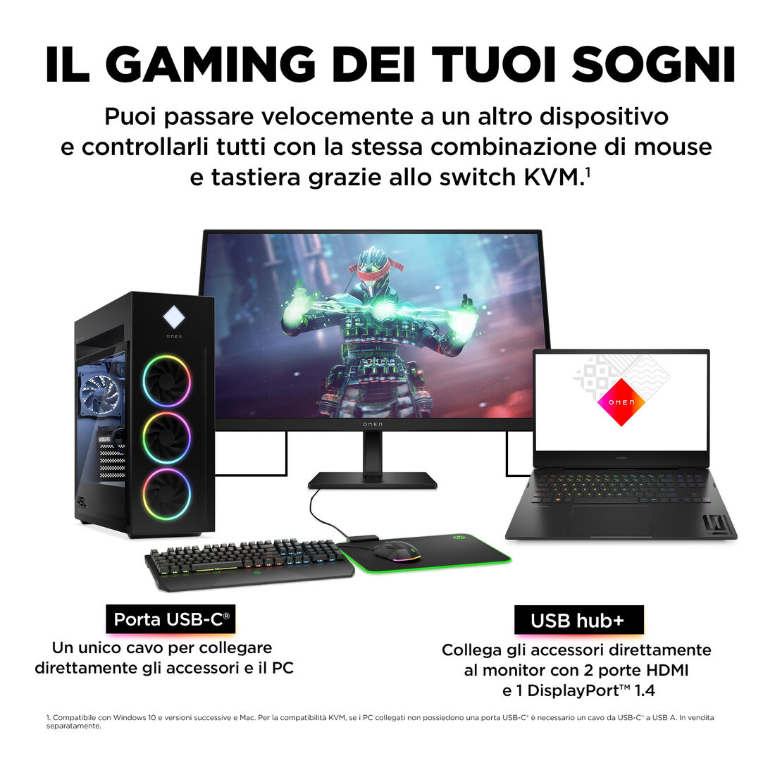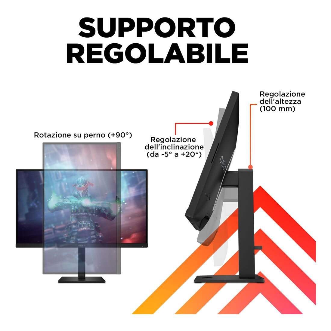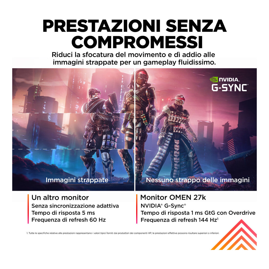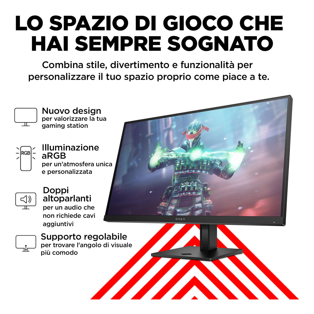 OMEN by HP Monitor da gaming OMEN by 27″ UHD 144 Hz – OMEN 27k. Dimensioni diagonale schermo: 68,6 cm (27″), Risoluzione del display: 3840 x 2160 Pixel, Tipologia HD: 4K Ultra HD, Tecnologia display: LCD, Superficie display: Opaco, Tempo di risposta: 1 ms, Rapporto d’aspetto nativo: 16:9, Angolo di visualizzazione (orizzontale): 178°, Angolo di visualizzazione (verticale): 178°. Altoparlanti incorporati. Hub USB integrato. Montaggio standard VESA, Regolazione altezza. Colore del prodotto: Nero