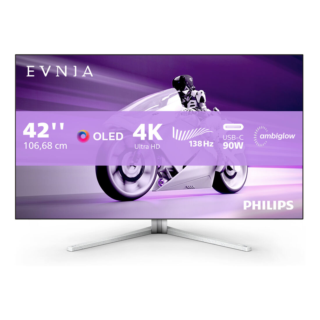 Philips 42M2N8900/00. Dimensioni diagonale schermo: 105,5 cm (41.5″), Risoluzione del display: 3840 x 2160 Pixel, Tipologia HD: 4K Ultra HD, Tecnologia display: OLED, Tempo di risposta: 0,1 ms, Rapporto d’aspetto nativo: 16:9, Angolo di visualizzazione (orizzontale): 178°, Angolo di visualizzazione (verticale): 178°. Altoparlanti incorporati. Hub USB integrato, Versione dell’hub USB: 3.2 Gen 1 (3.1 Gen 1). Montaggio standard VESA, Regolazione altezza. Colore del prodotto: Bianco