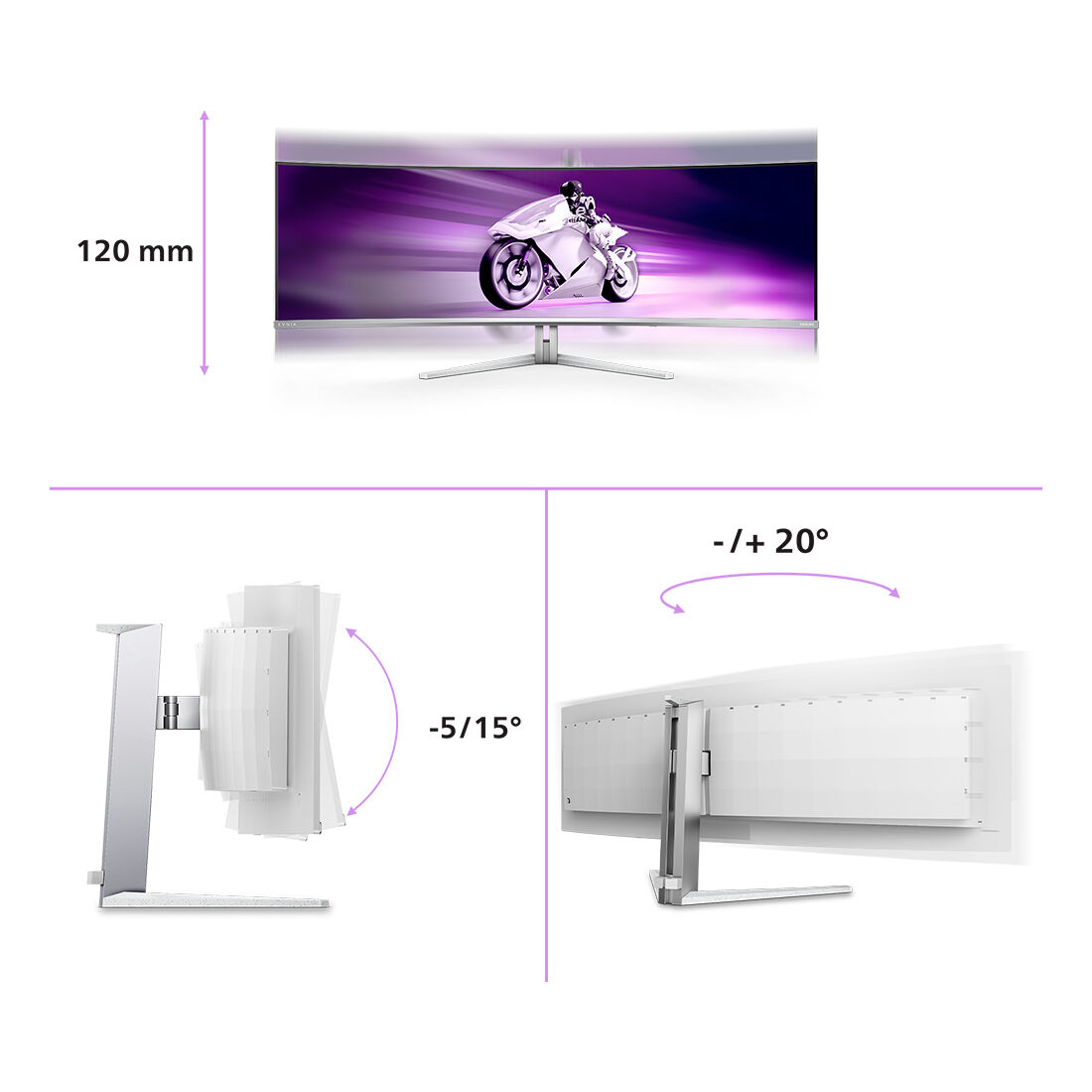 Philips Evnia 8000 49M2C8900L/00. Dimensioni diagonale schermo: 124,2 cm (48.9″), Risoluzione del display: 5120 x 1440 Pixel, Tipologia HD: Dual QHD, Tecnologia display: QD-OLED, Tempo di risposta: 0,03 ms, Rapporto d’aspetto nativo: 32:9, Angolo di visualizzazione (orizzontale): 178°, Angolo di visualizzazione (verticale): 178°. Altoparlanti incorporati. Hub USB integrato. Montaggio standard VESA, Regolazione altezza. Colore del prodotto: Bianco
